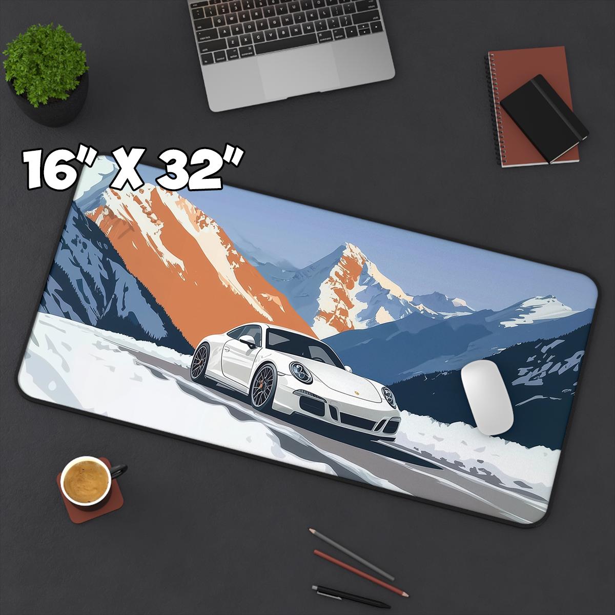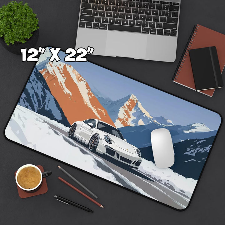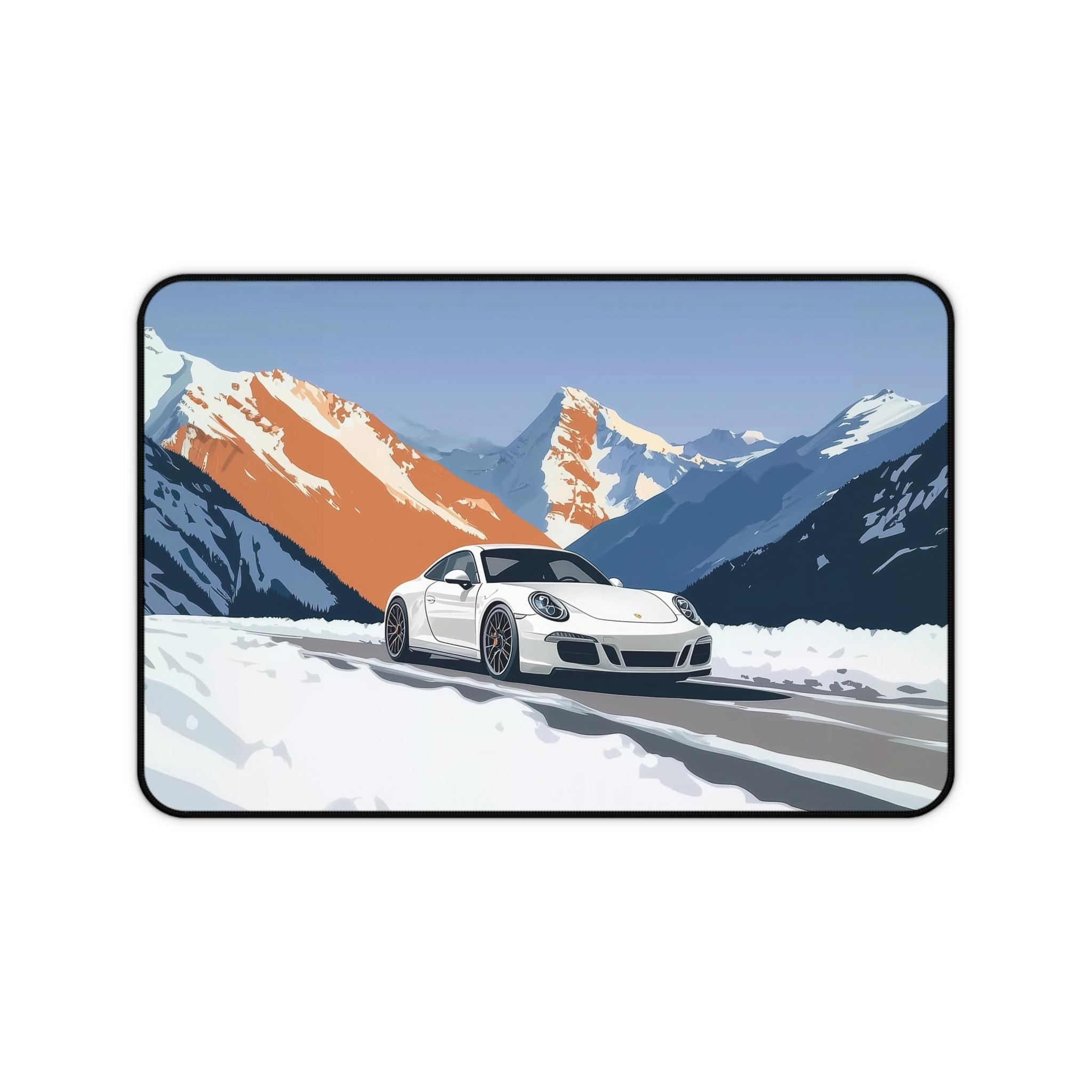 Epic Snow Drift Design: Showcases a 911 sports car powering through snow—adds energy and motion to any desk setup.