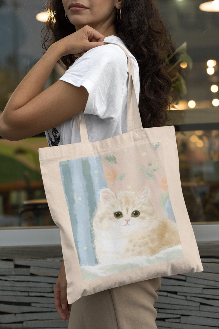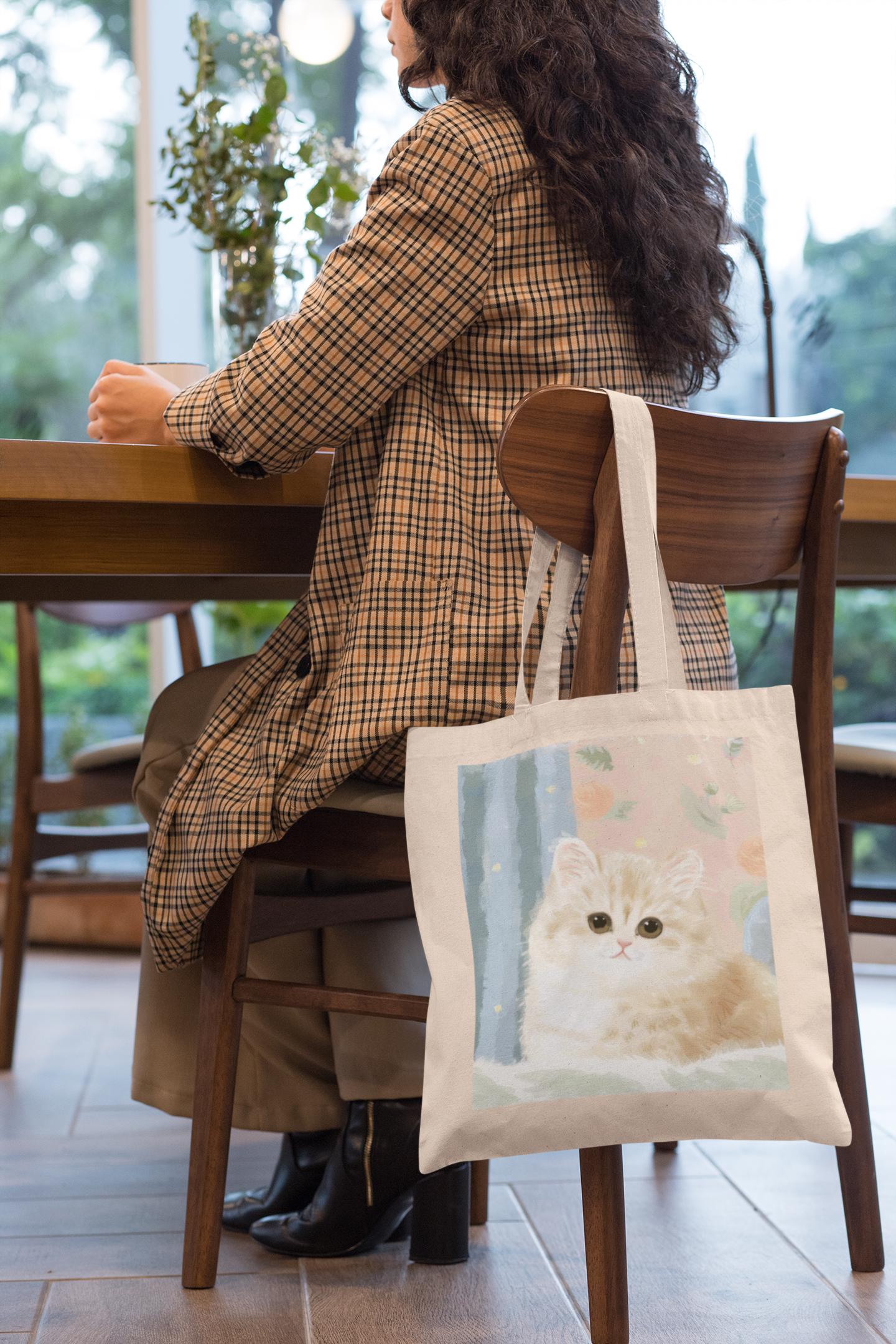 Adorable Kitty Design: Showcasing a playful and charming kitty graphic, this tote bag is perfect for cat lovers and anyone who appreciates a bit of fun and cuteness in their accessories.