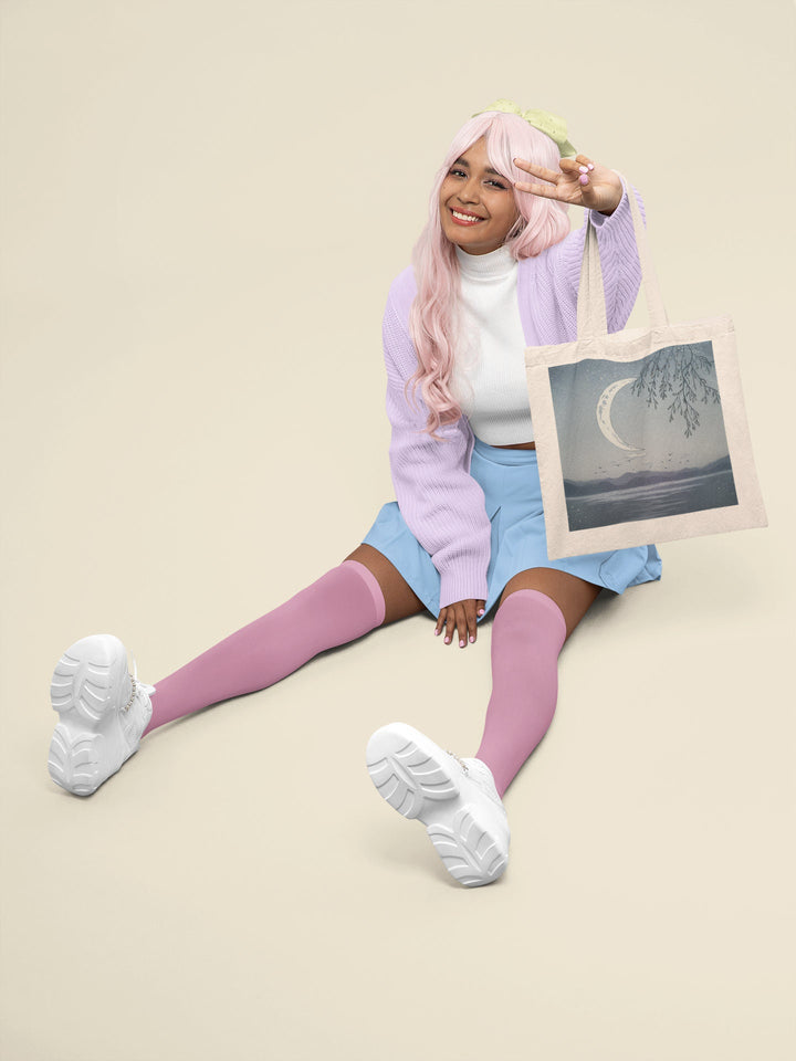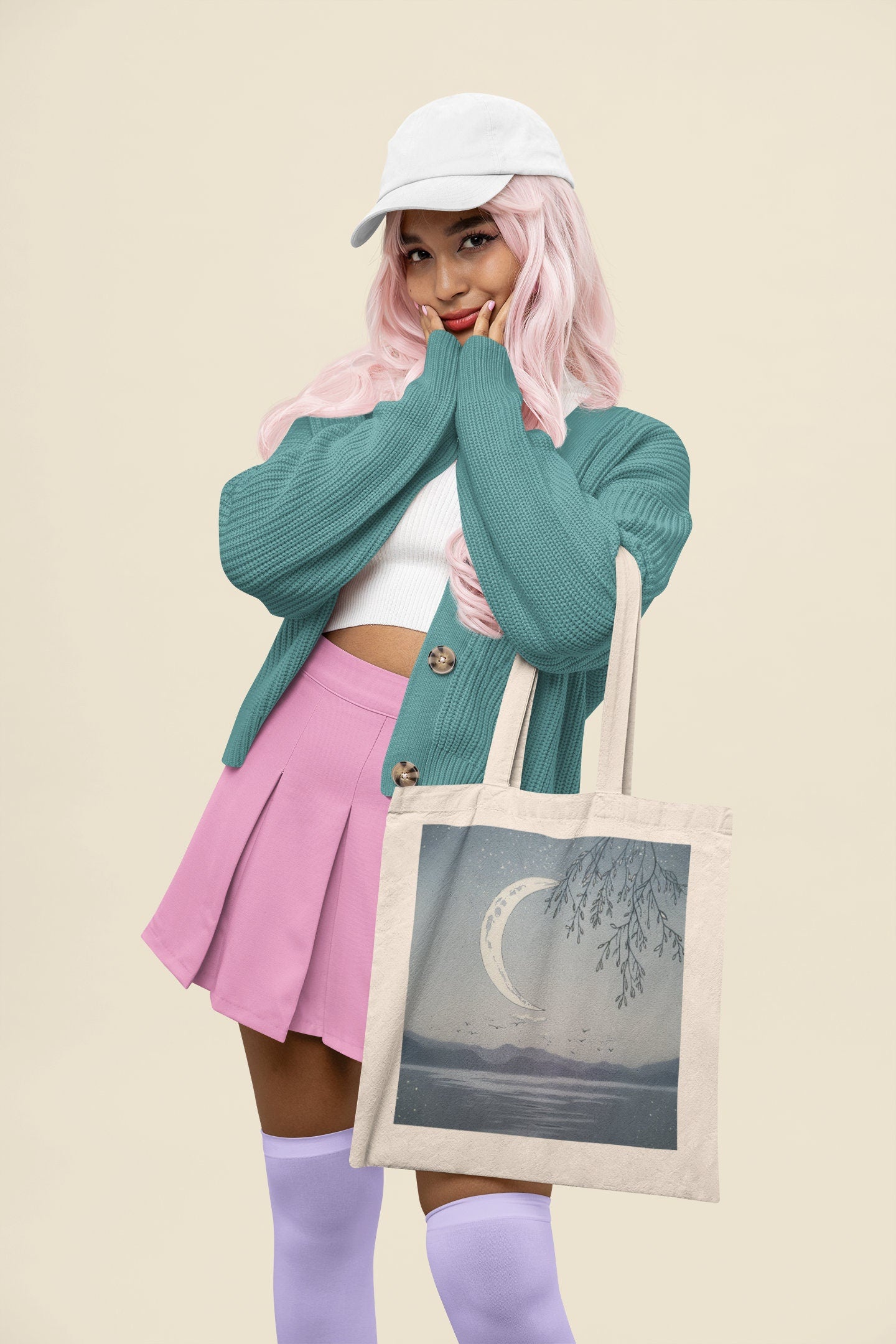 Perfect for stargazers, night owls, or anyone seeking a unique and inspired accessory, the "Aesthetic Crescent Moon" Tote Bag is not just a bag — it's a celestial journey that accompanies you day and night.