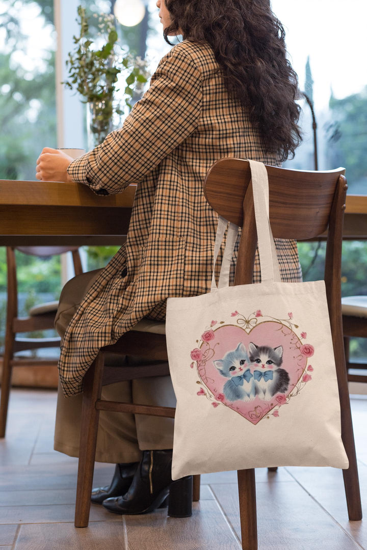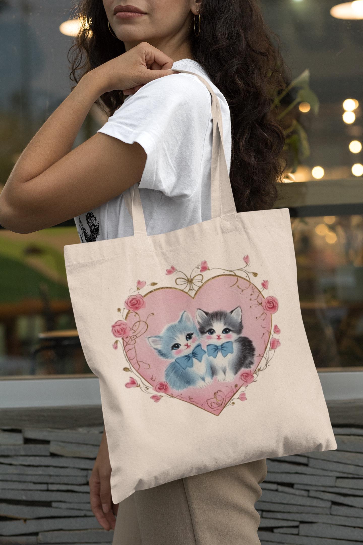 Adorable Heart and Kitty Design: Showcases a sweet and affectionate kitty surrounded by hearts, making it a perfect tote for cat lovers.