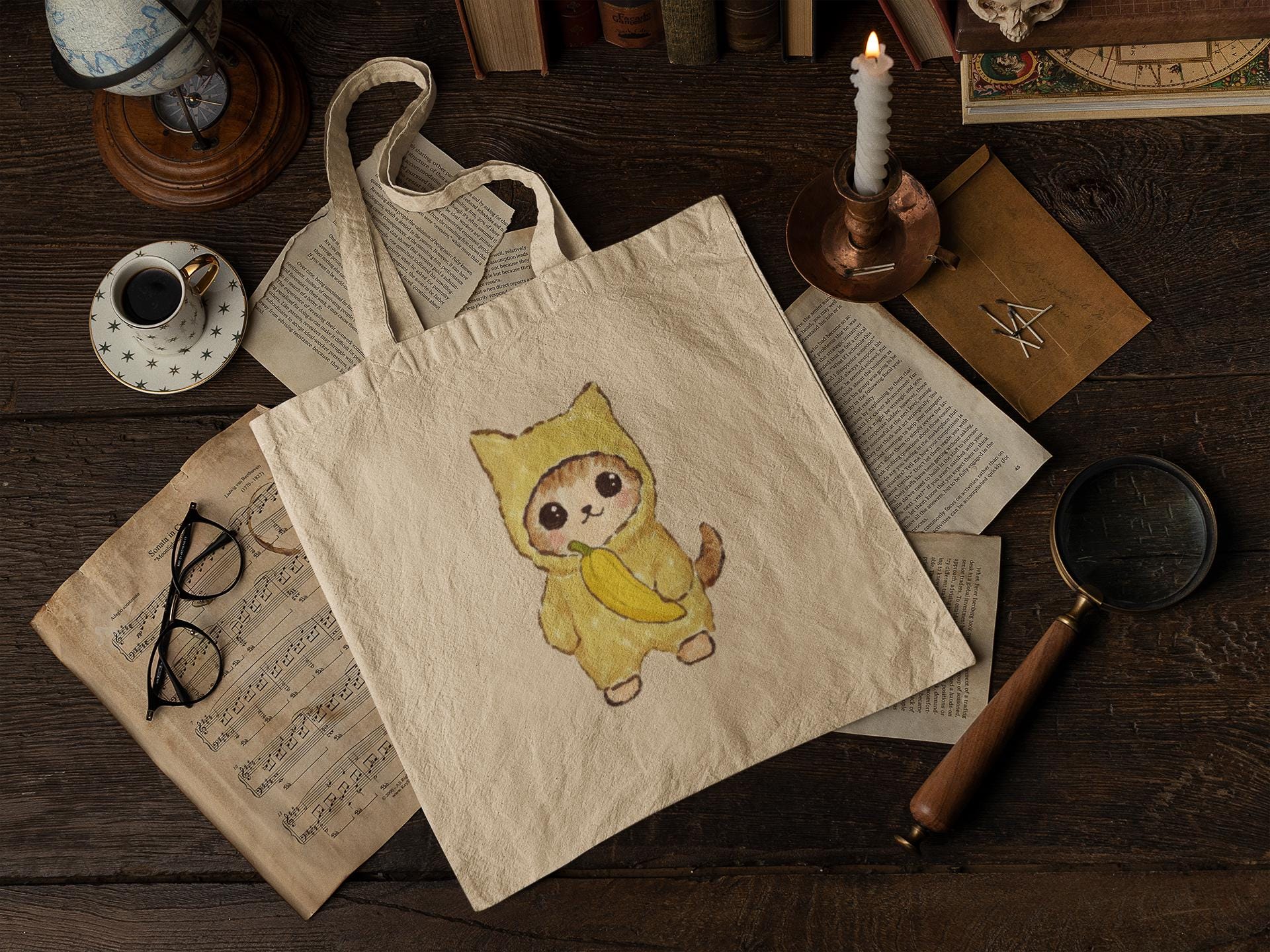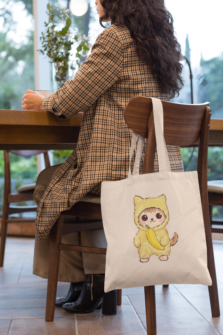 Bring a touch of whimsy to your wardrobe with the Banana Kitty Tote Bag, where cuteness meets functionality.
