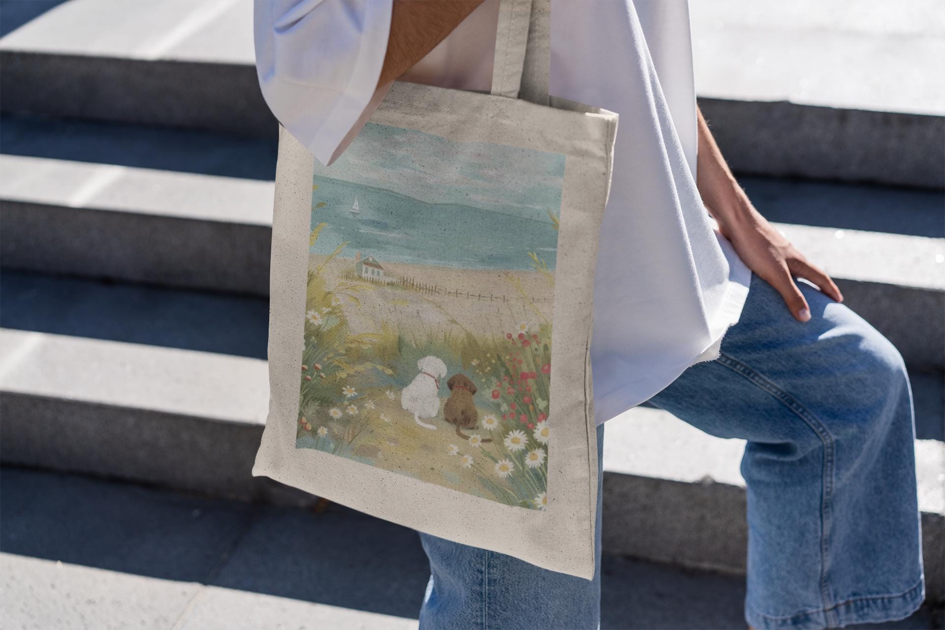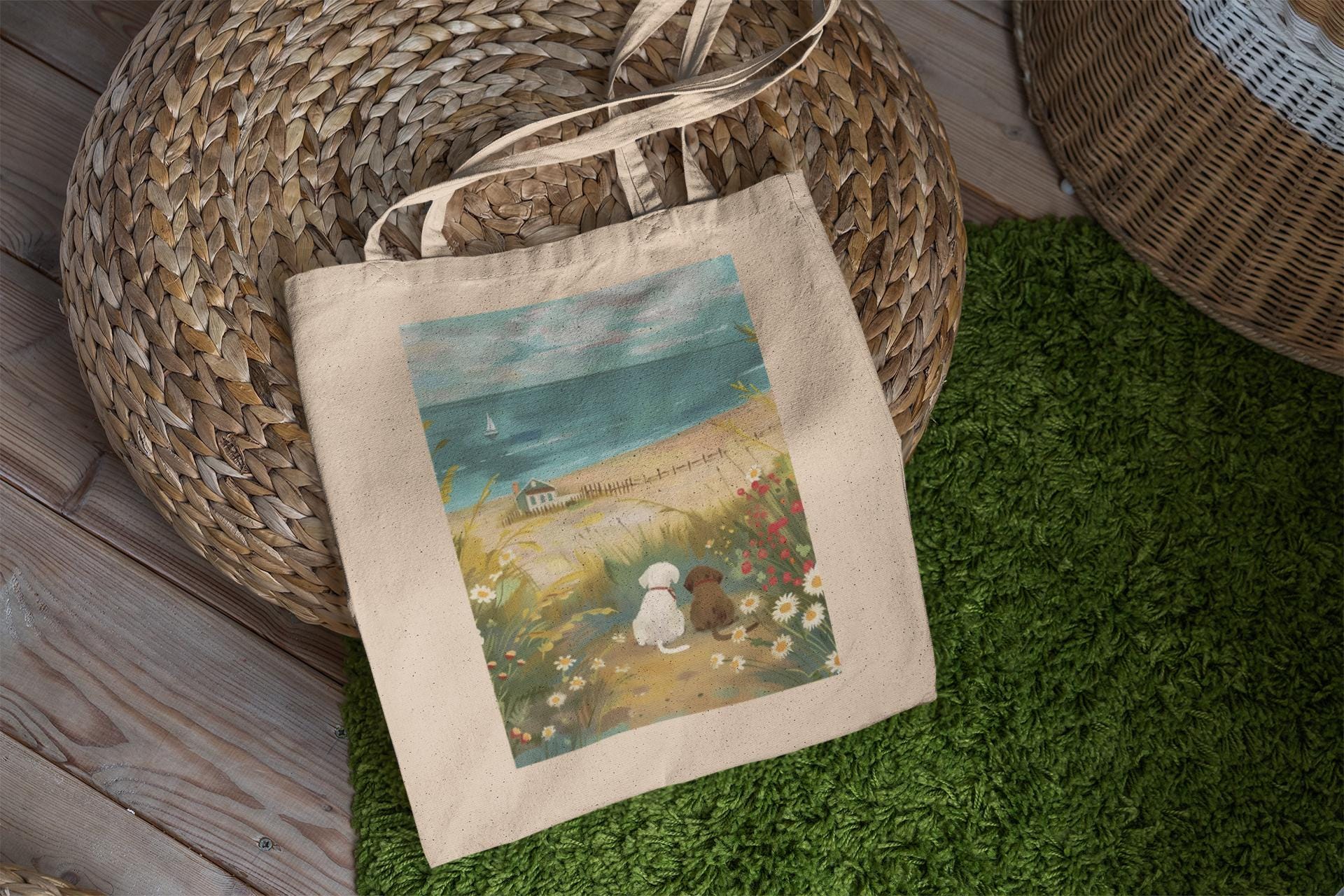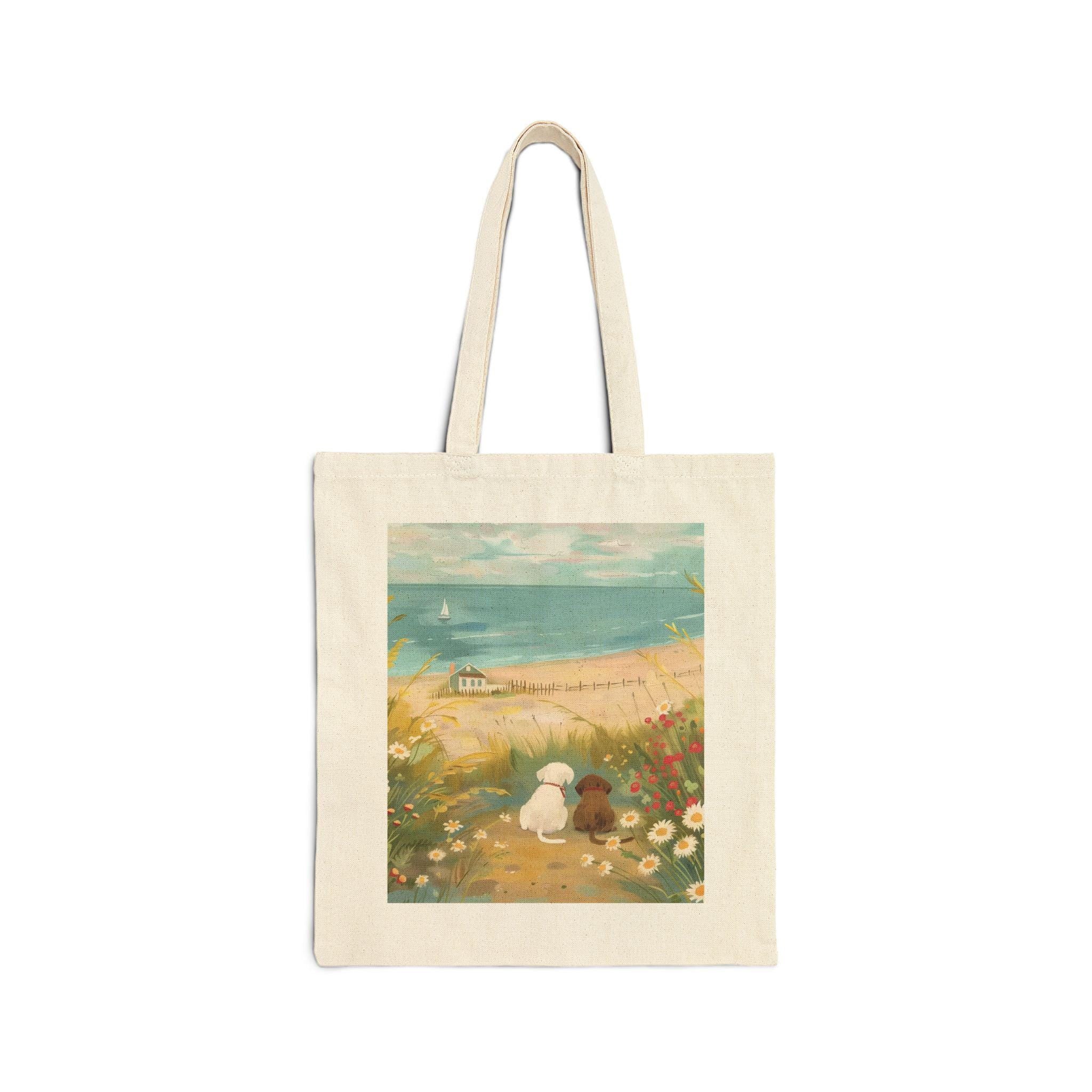 Charming Design: Showcases playful dogs having fun at the beach. The delightful illustration adds a touch of whimsy and fun to your beach outings or daily errands.