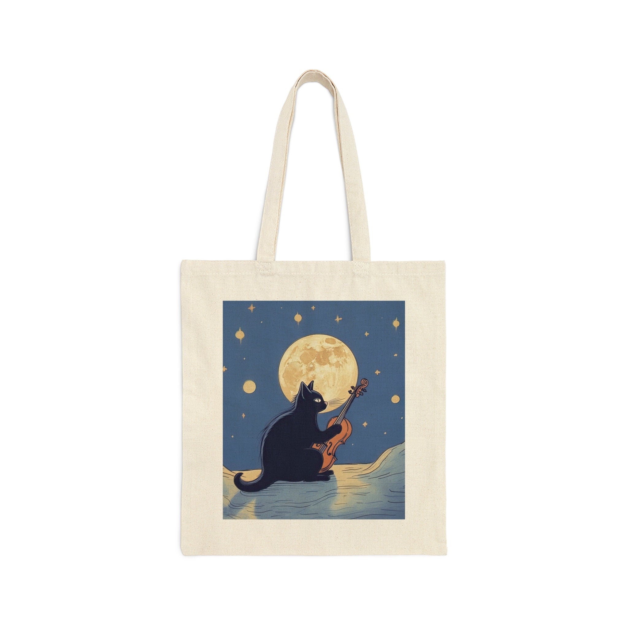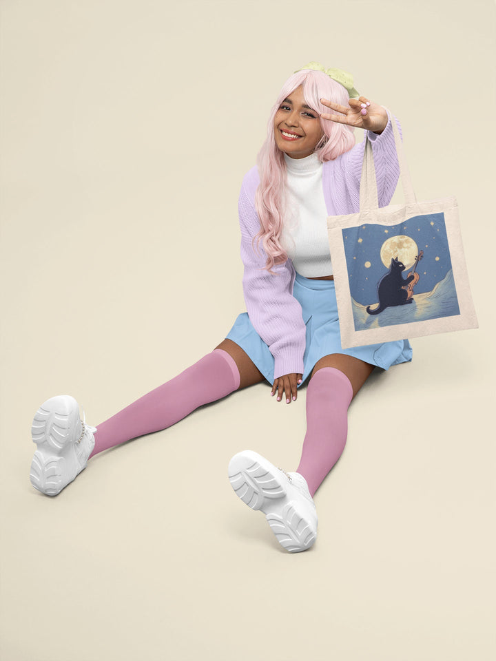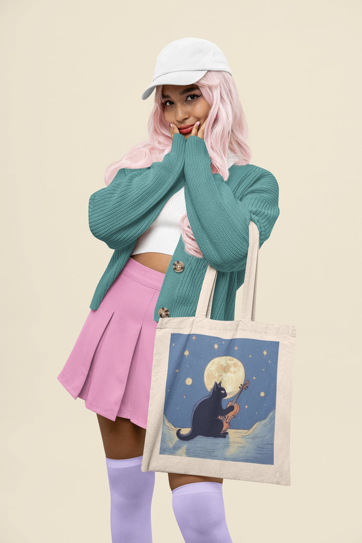 Unique Musical Design: The tote features a charming illustration of a black cat with a violin, blending feline beauty with musical elegance in an eye-catching display.