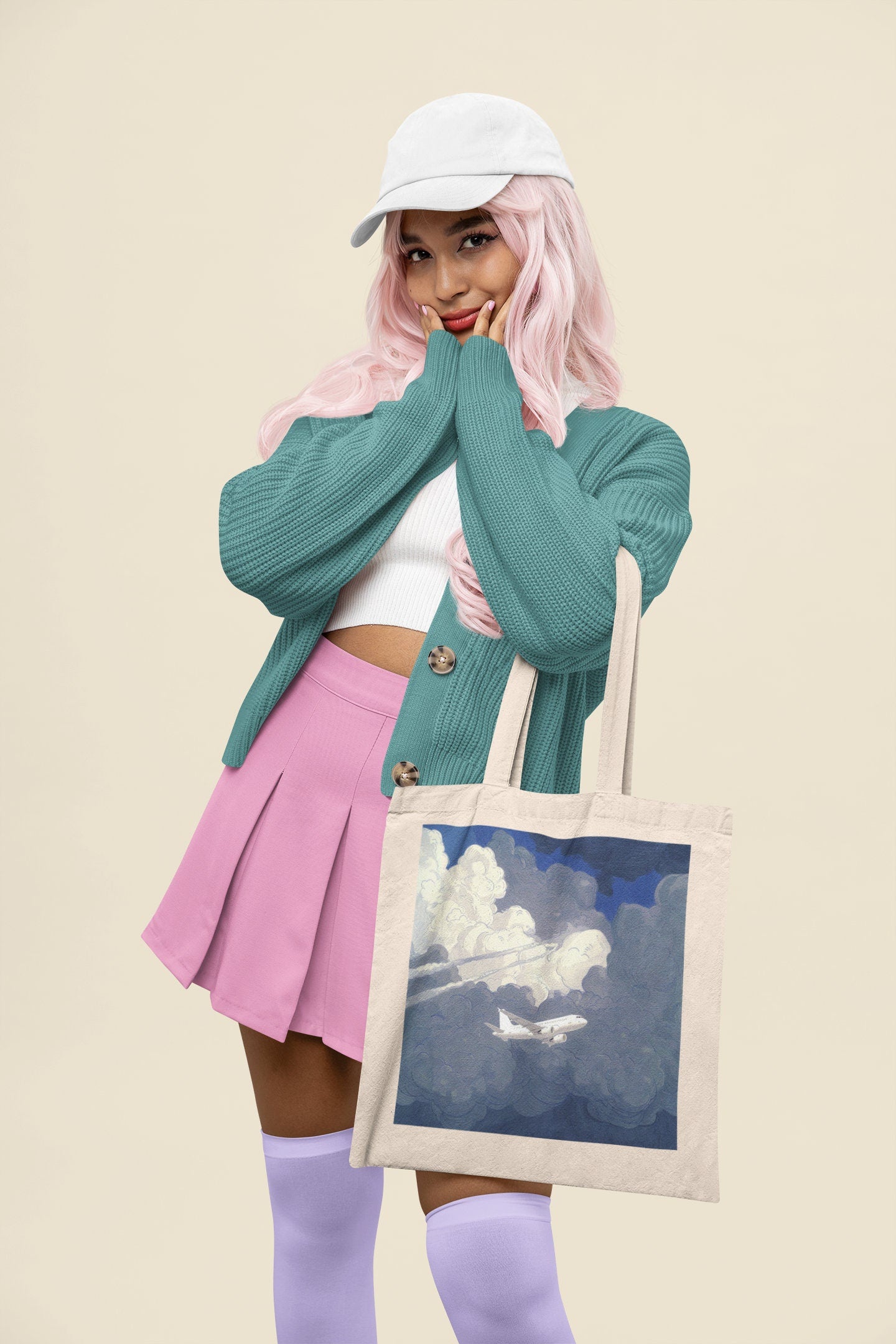 Inspiring Skyline Design: Adorned with a breathtaking illustration of an airplane soaring above the clouds, this tote bag evokes a sense of freedom and exploration. Its detailed artwork and soothing color palette make it a standout piece that complements any outfit.