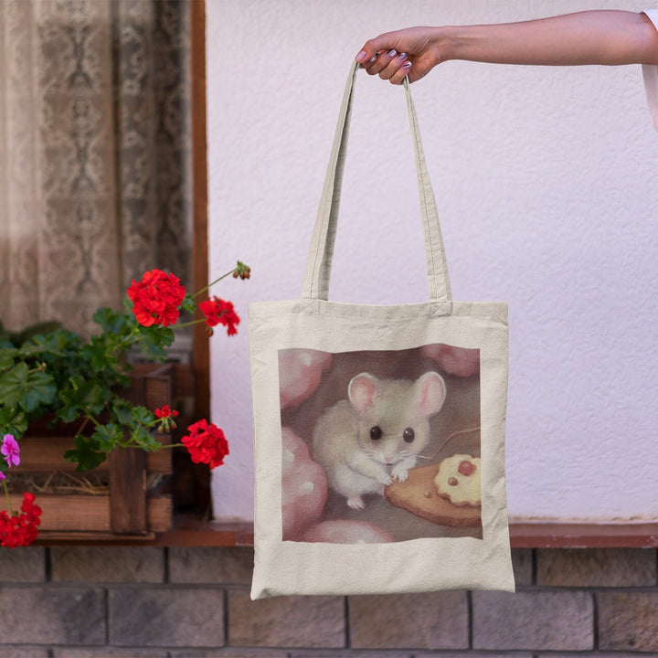 Charming Cookie Mouse Design: The tote showcases a heartwarming illustration of a mouse savoring a cookie, evoking feelings of joy and innocence.