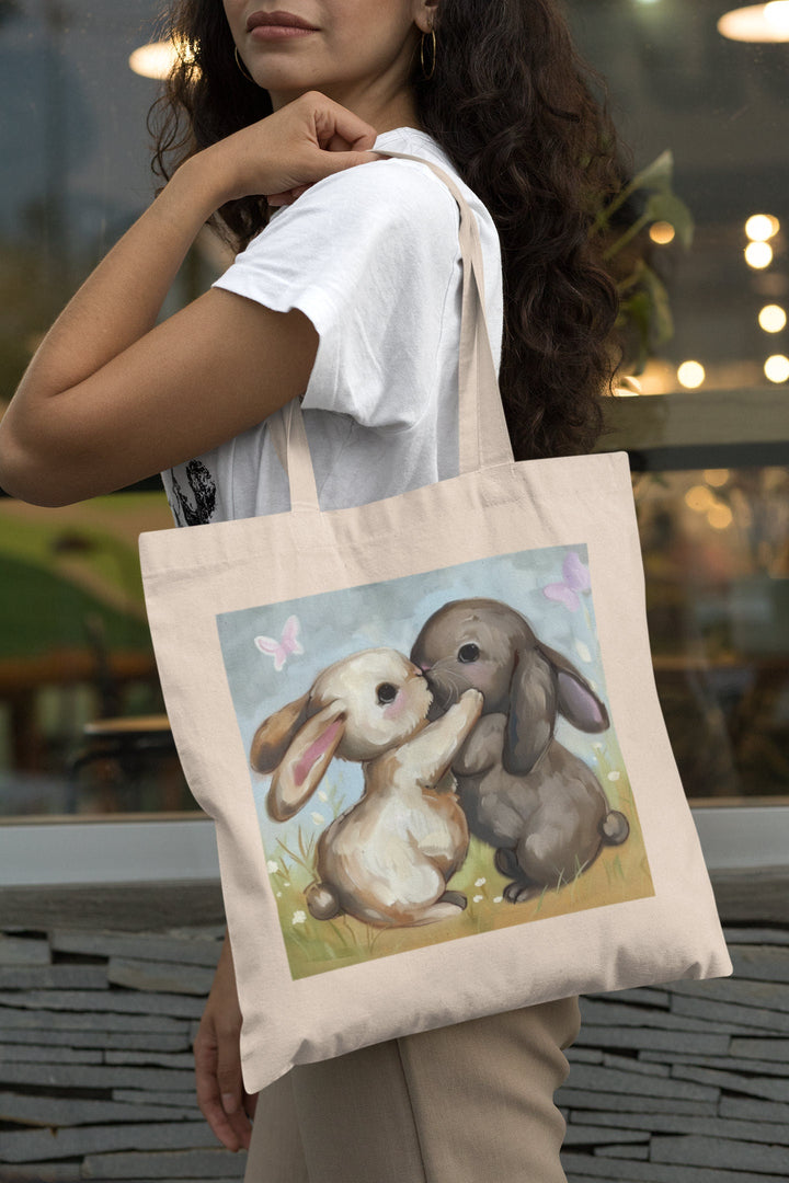 Charming Bunny Friends Design: Adorned with an engaging illustration of bunny friends, this tote bag showcases the playful and affectionate nature of these charming creatures. The artwork is both heartwarming and stylish, appealing to animal lovers and fashion enthusiasts alike.
