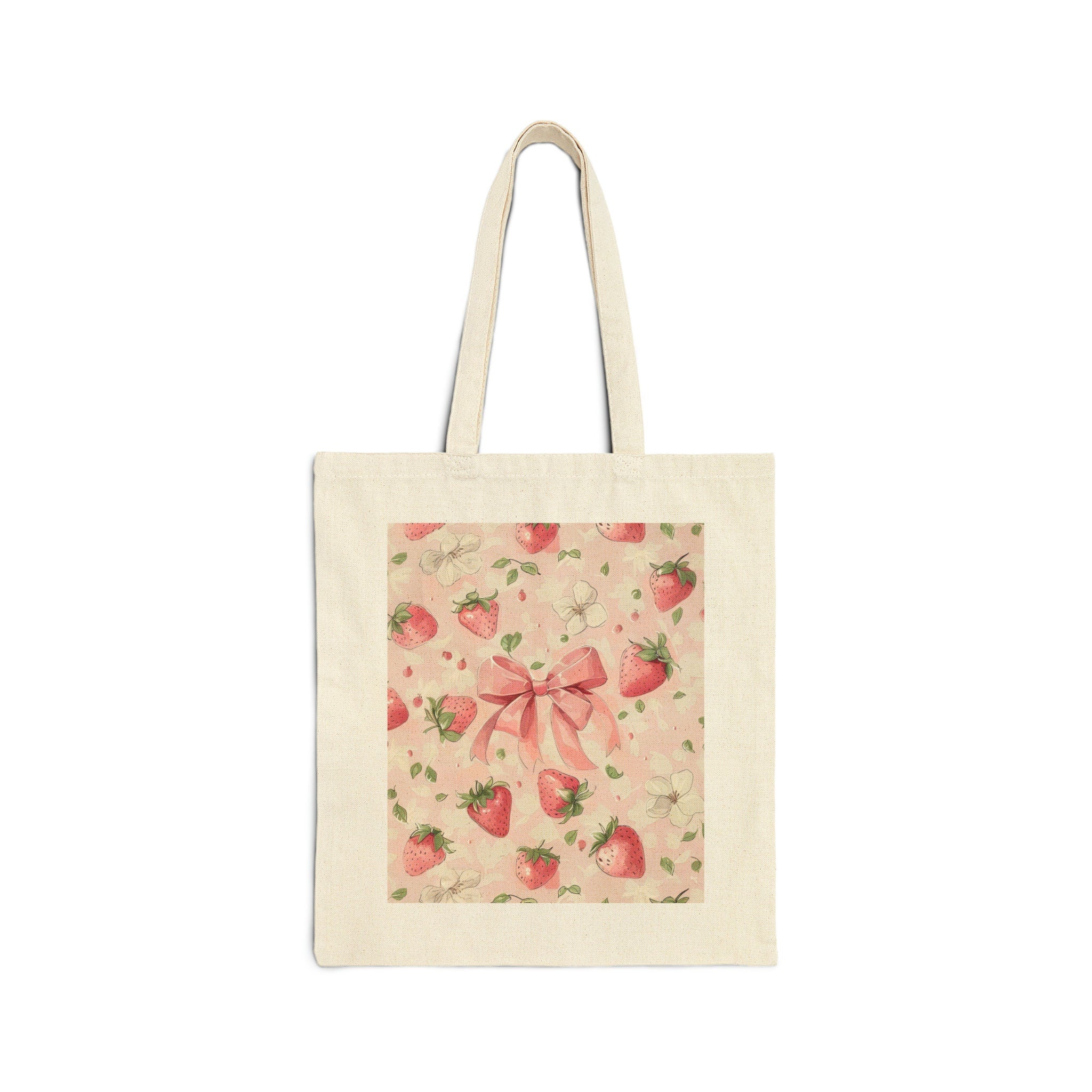 Charming Strawberry Design: Featuring a delightful illustration of strawberries adorned with a dainty bow, this tote bag exudes sweetness and charm. The vibrant colors and intricate details make it a standout accessory for any occasion.