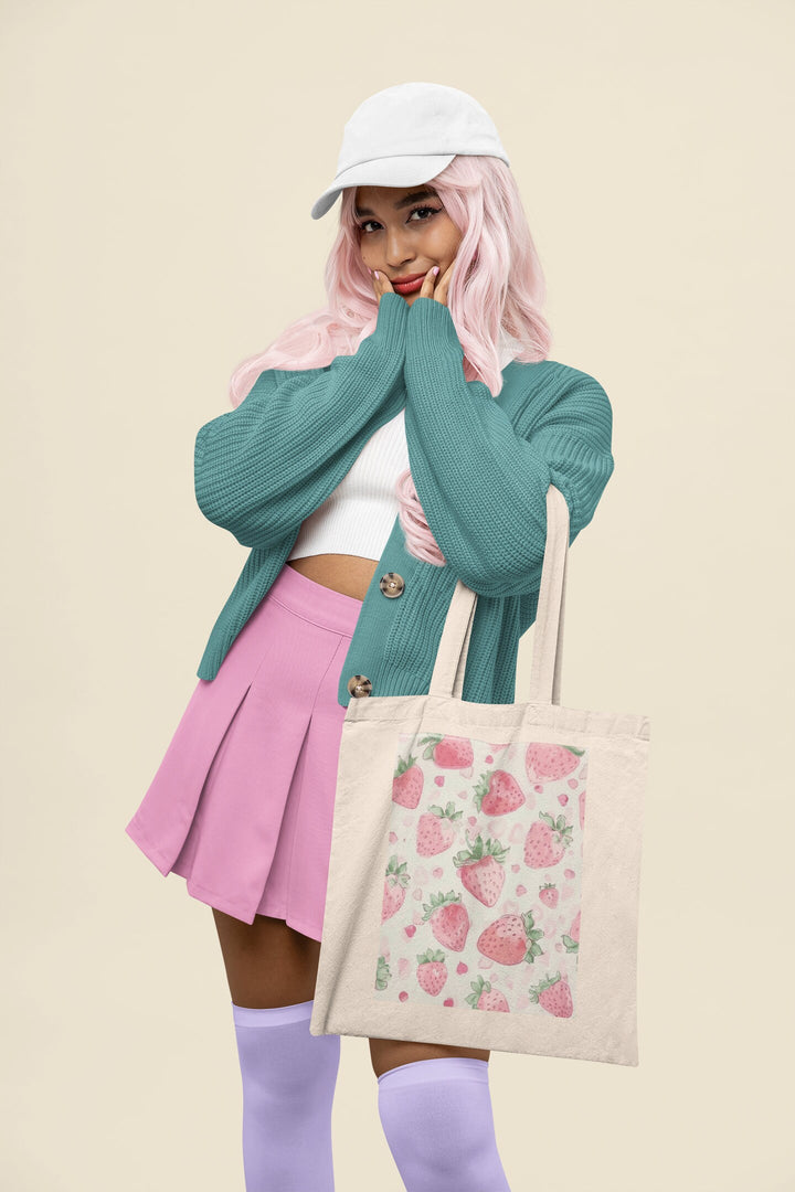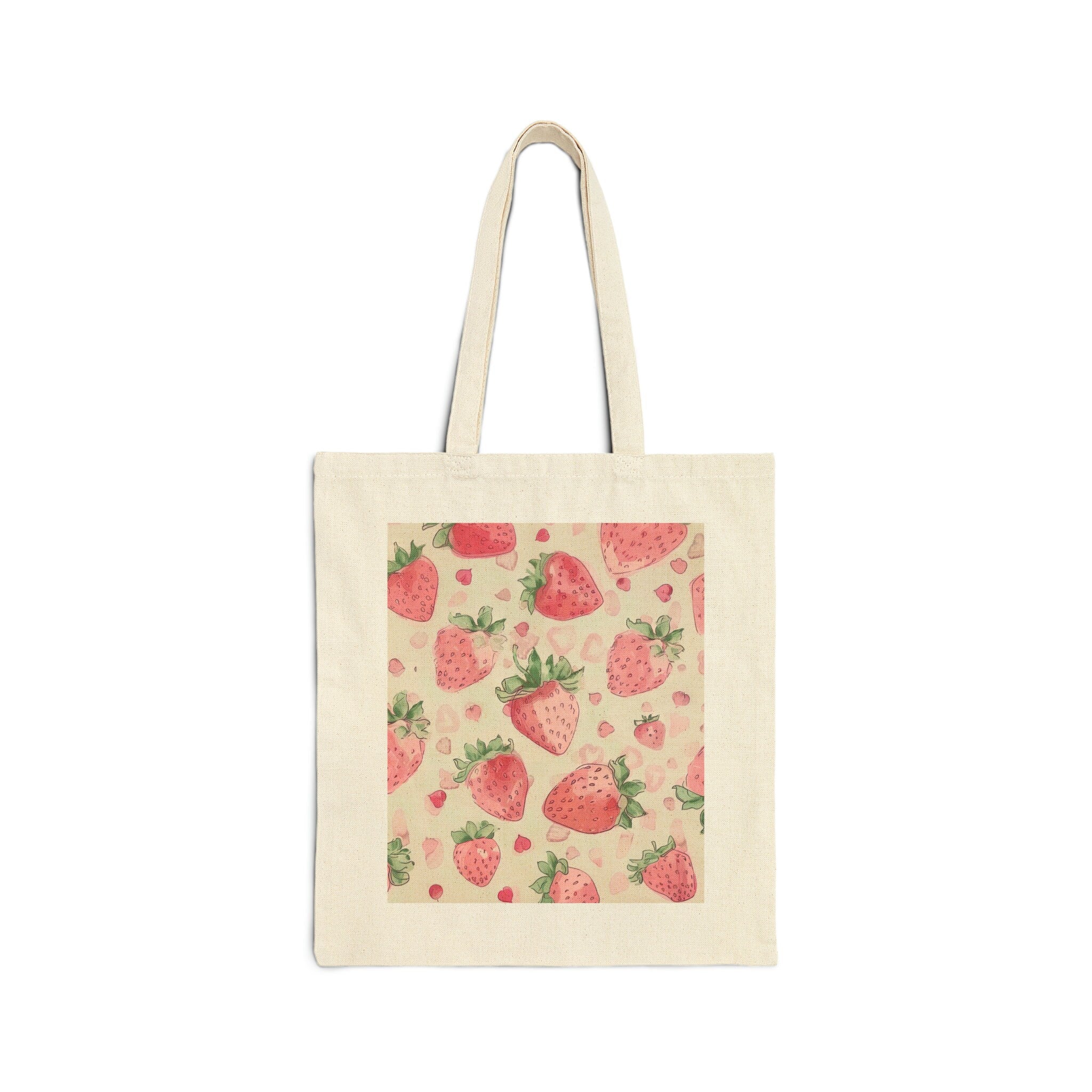 Vibrant Strawberry Design: Adorned with an eye-catching pattern of luscious strawberries, this tote bag is a testament to joy and sweetness. Its bright colors and playful design are sure to turn heads and bring a smile to your face.