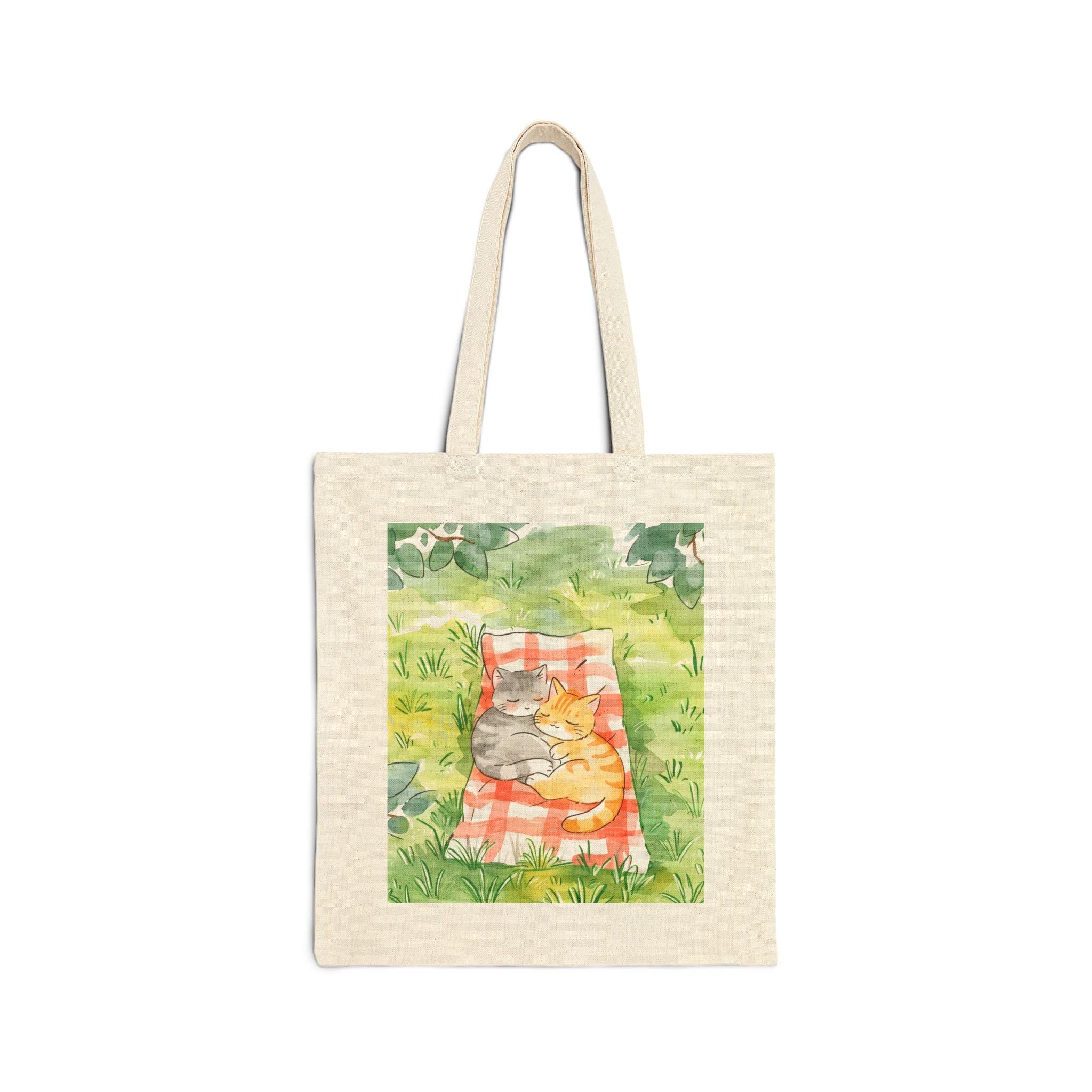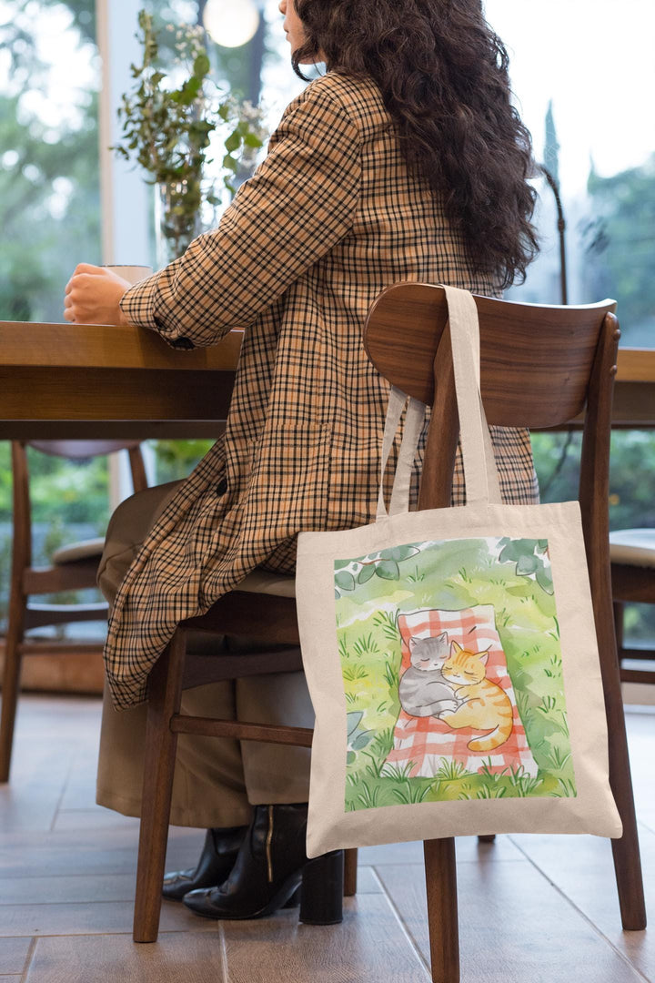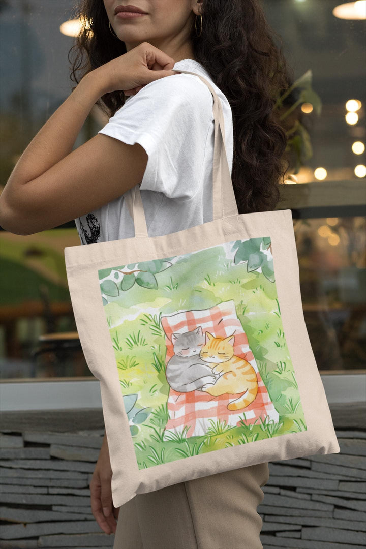 Adorable Feline Design: Showcasing cute kitties lounging under a sunny sky, this tote bag captures a whimsical and joyful vibe. The charming design adds a touch of fun and brightness to your everyday look.