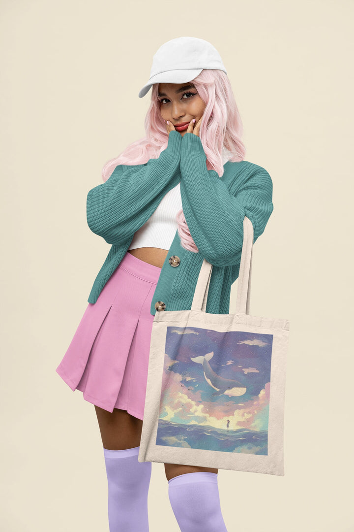 Enchanting Whale Illustration: Adorned with a mesmerizing illustration of majestic whales gracefully navigating through a dreamlike underwater world, this tote bag captures the essence of marine magic, making it a must-have for ocean lovers, dreamers, and anyone who cherishes the beauty of the sea.