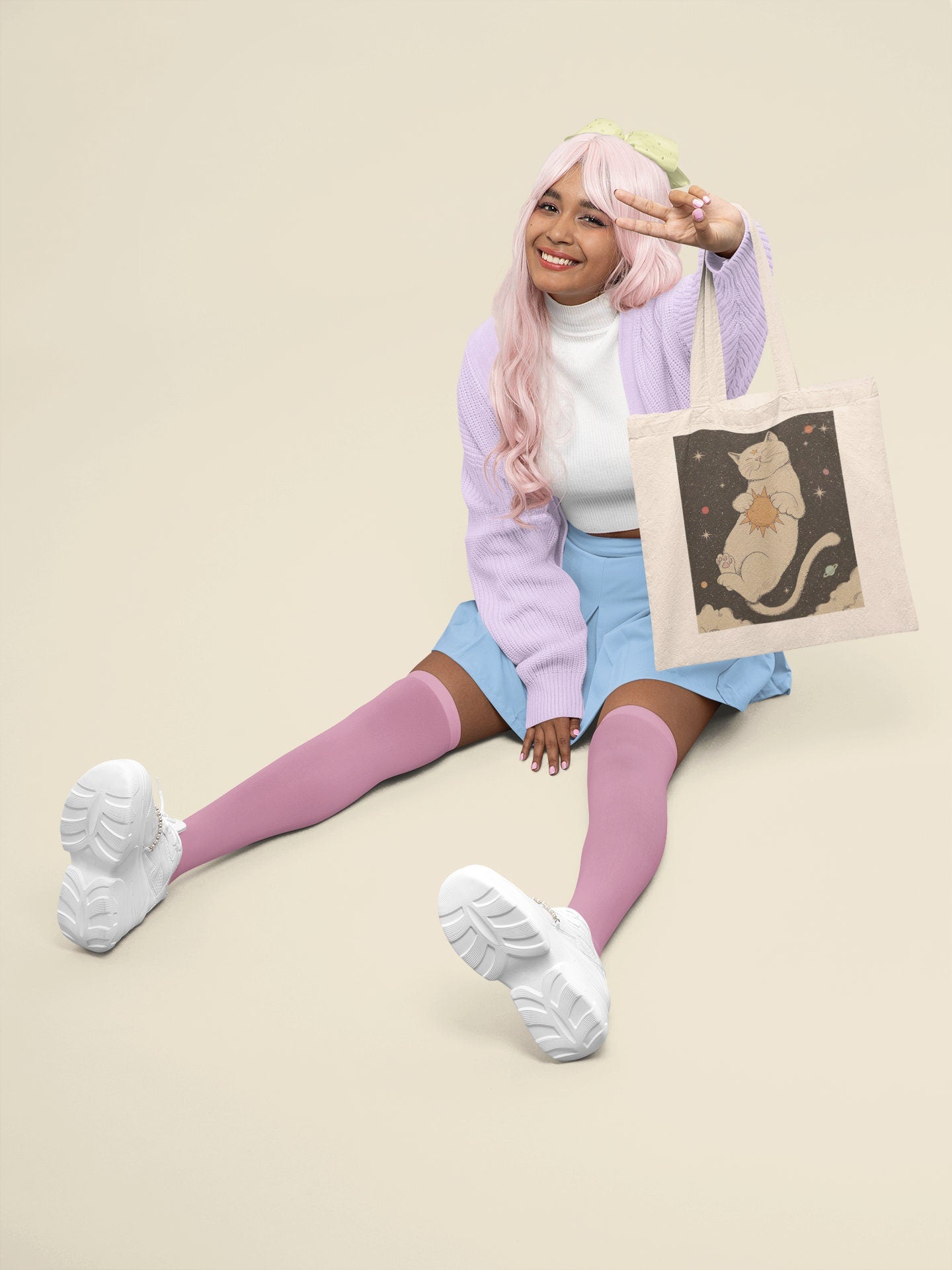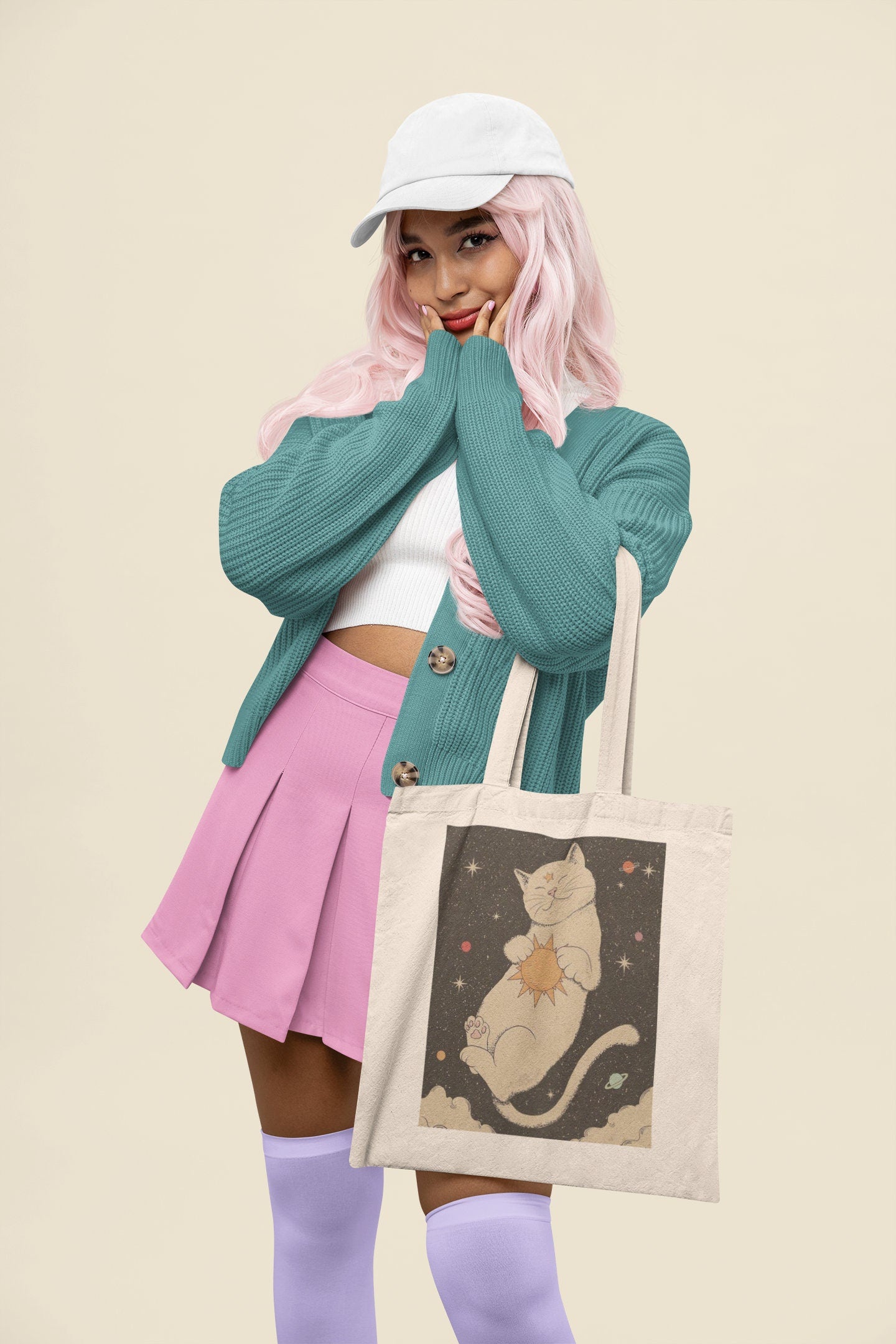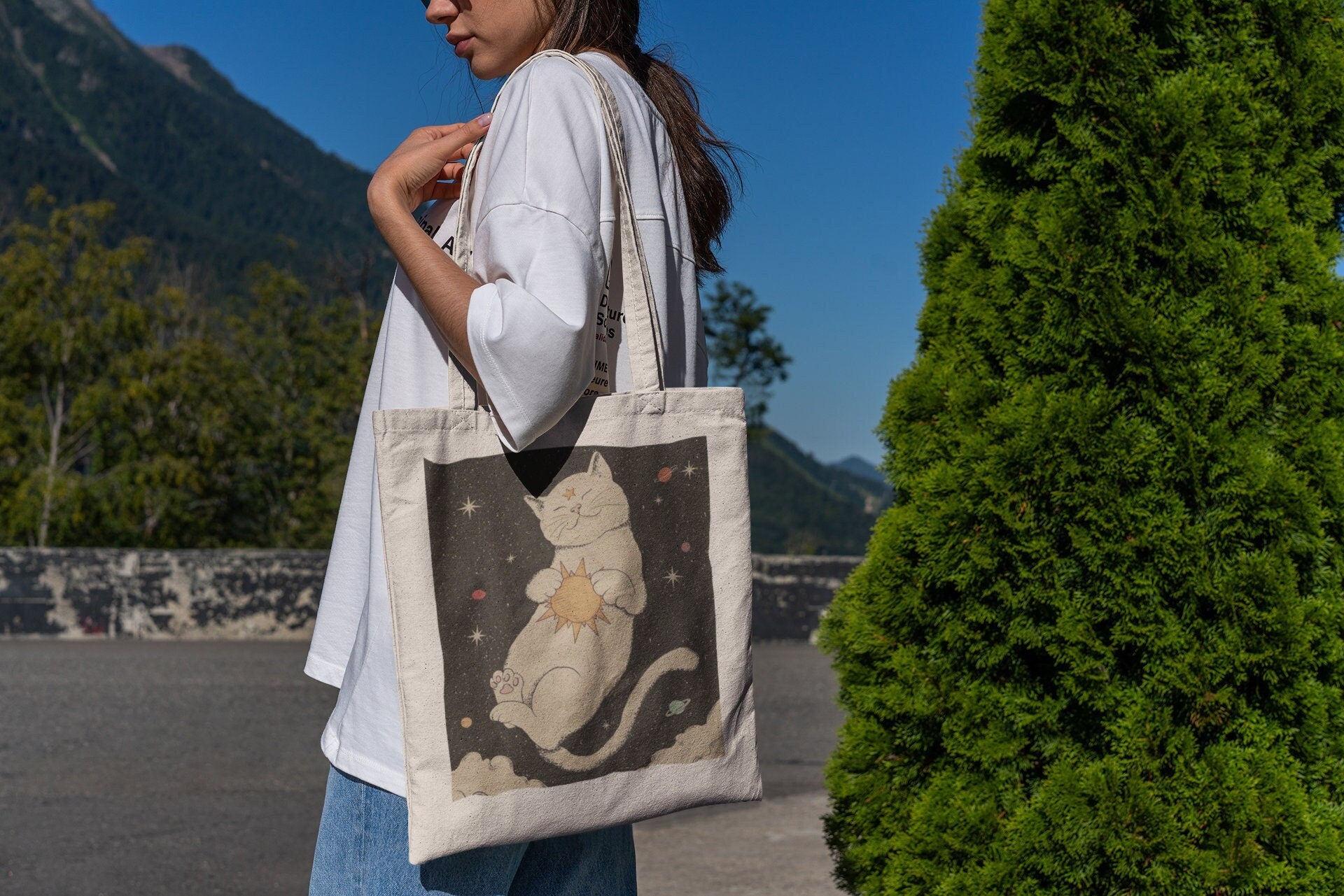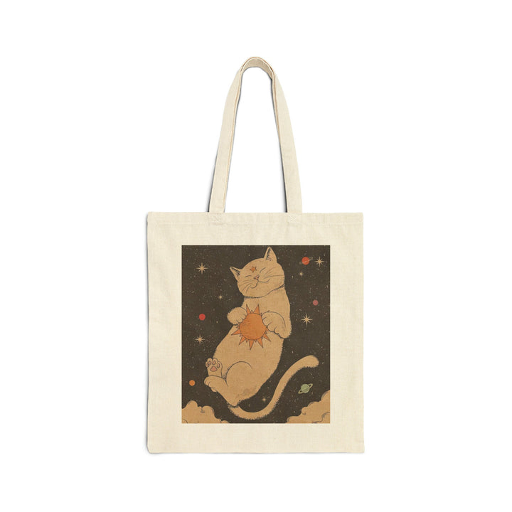 Cosmic Cat Design: Adorned with an enchanting depiction of a galaxy-inspired cat, this tote bag becomes a canvas of cosmic cuteness and charm, making it a must-have for cat lovers and those who appreciate the mysteries of space.