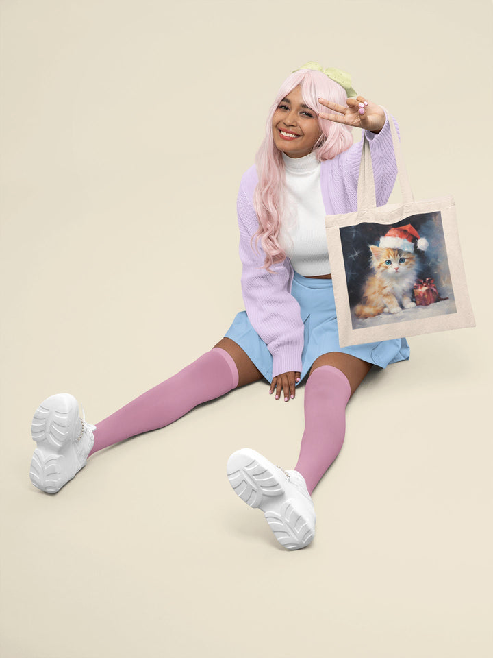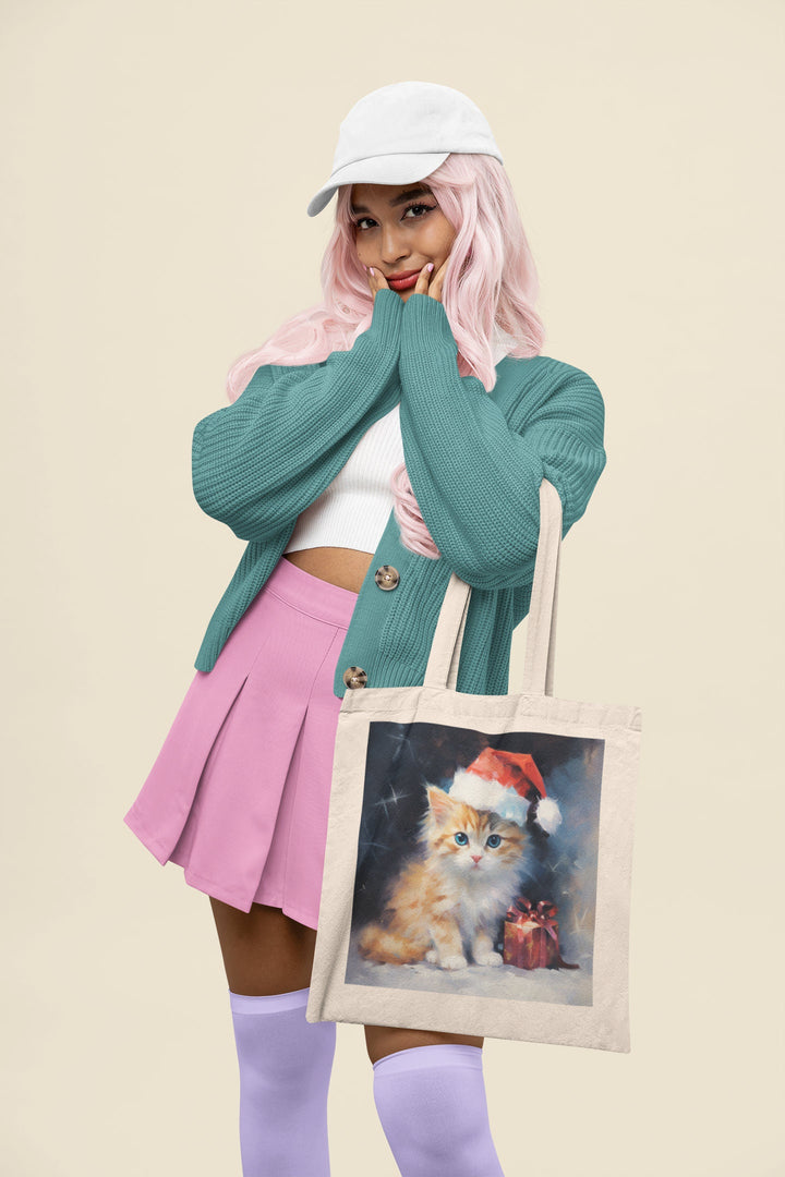 Festive Feline Fusion: Showcasing an endearing calico cat amidst seasonal decorations or motifs, this tote resonates with holiday warmth and cat lover sentiments.