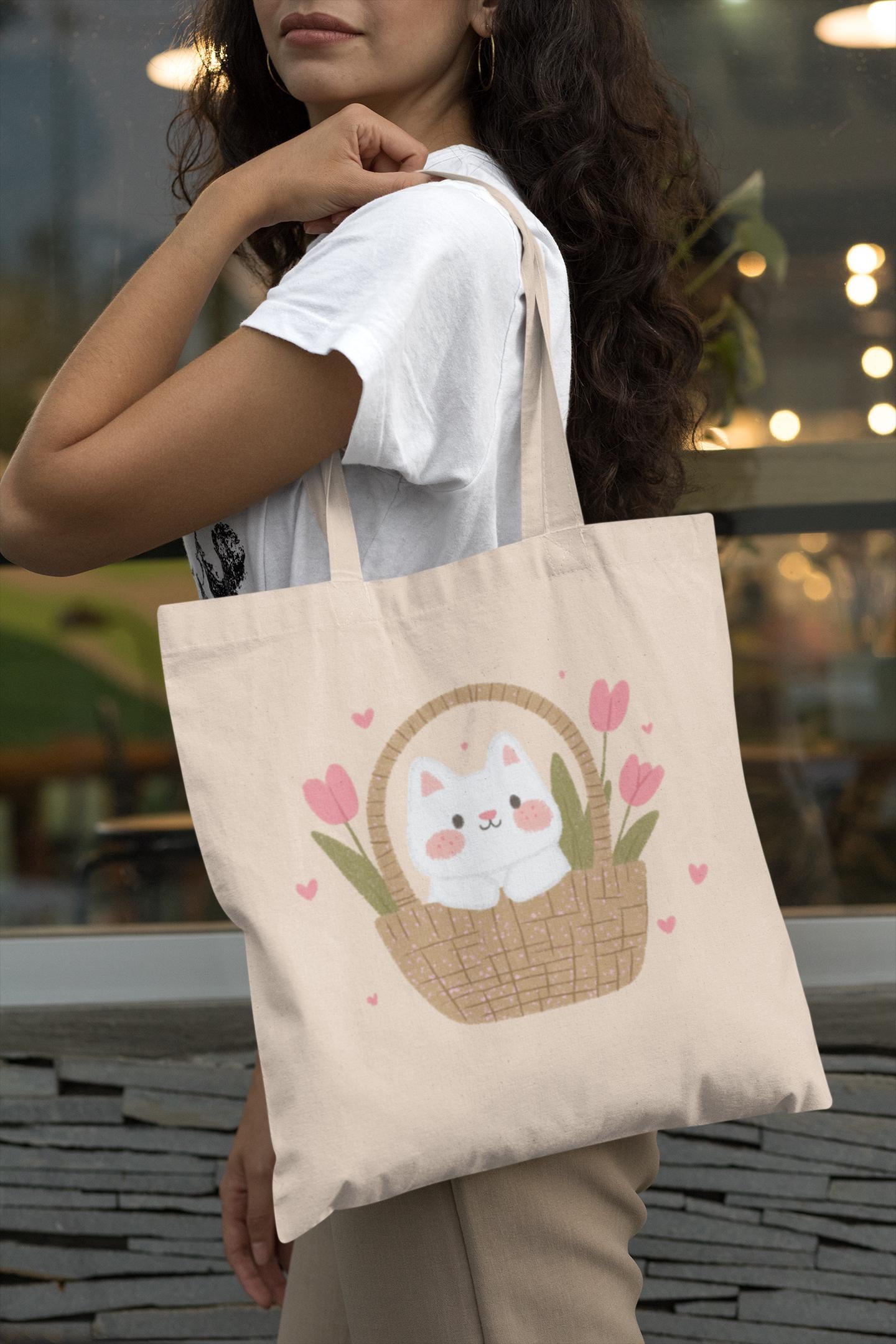 Add a touch of cuteness to your daily routine with the White Kitty Basket Tote Bag. Featuring a charming white kitty snuggled in a basket, this tote is the perfect accessory for cat lovers who enjoy playful and stylish designs. Ideal for shopping, work, or casual outings, this tote brings both charm and practicality to your day.