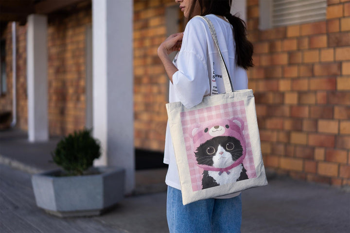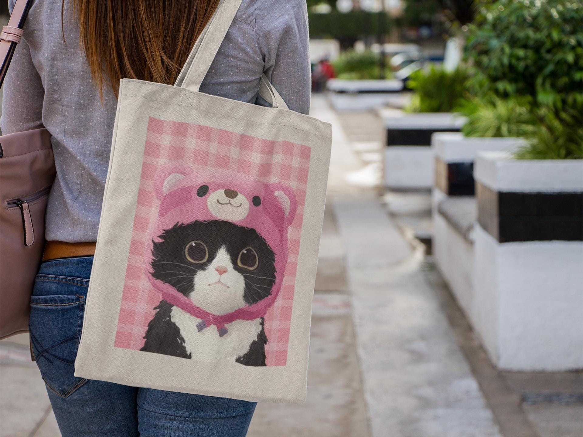 Add a pop of sweetness to your day with the Kitty with Pink Bear Hat Tote Bag, featuring a charming kitty wearing a fuzzy pink bear hat. This tote blends cozy cuteness with aesthetic flair—perfect for errands, school, or gifting to someone who loves all things adorable.