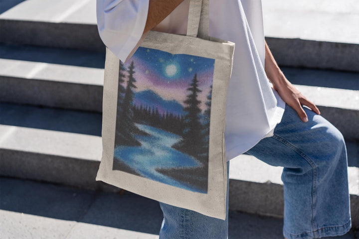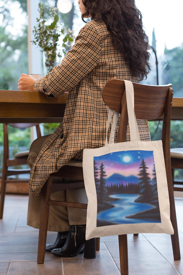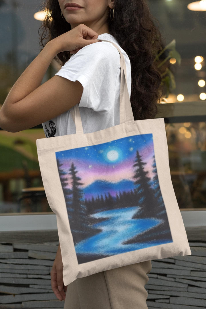 Embrace the serene beauty of the wilderness with the Night Sky Pine Trees Tote Bag, featuring a captivating design of pine trees silhouetted against a starry night sky. Perfect for nature lovers and stargazers, this tote combines practicality with a touch of cosmic wonder, making it ideal for shopping, school, or casual outings.