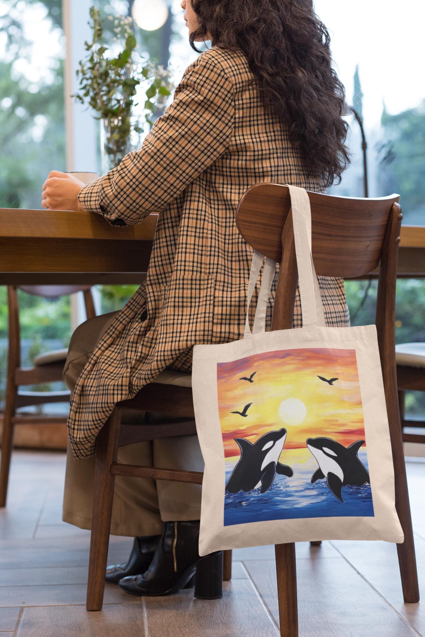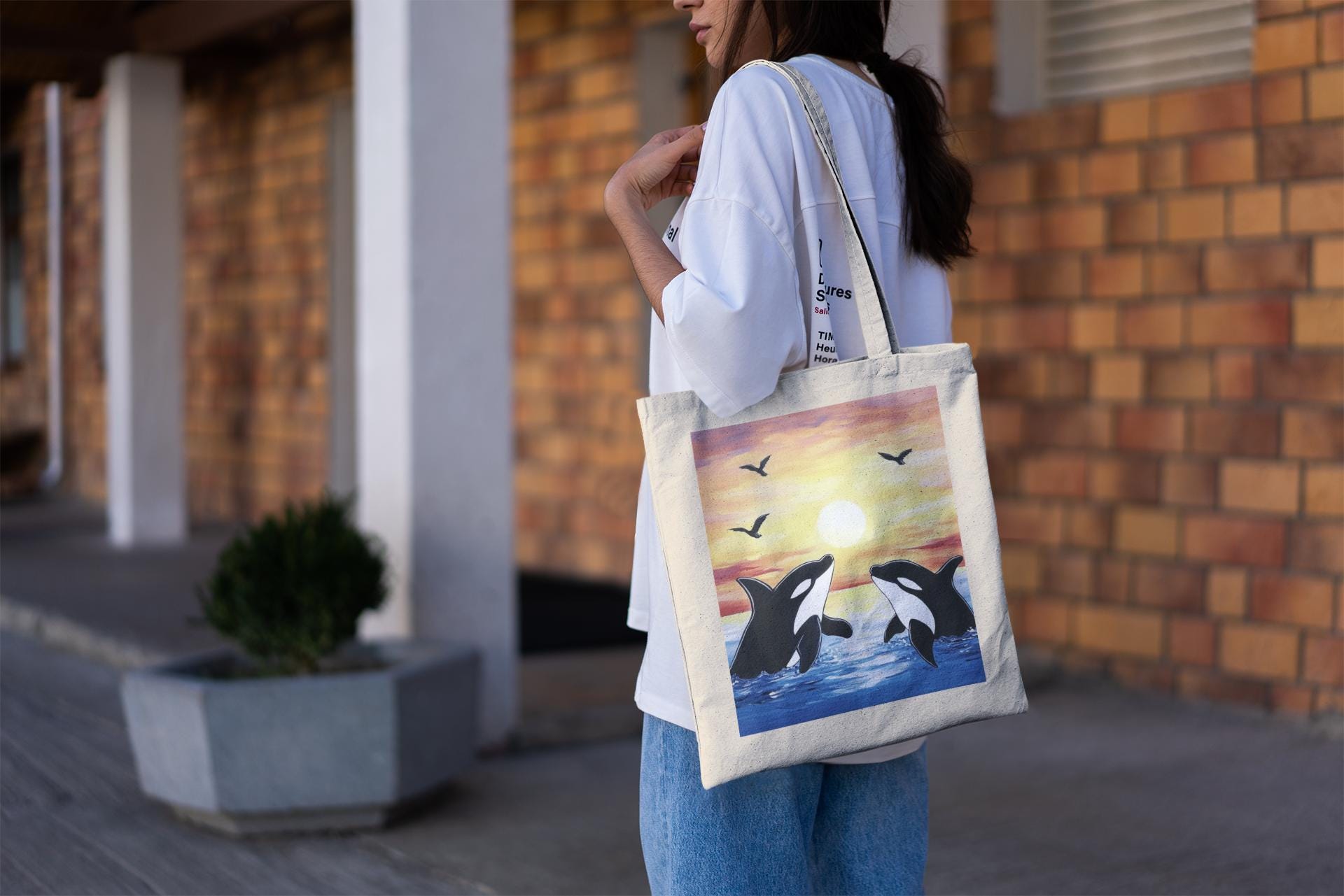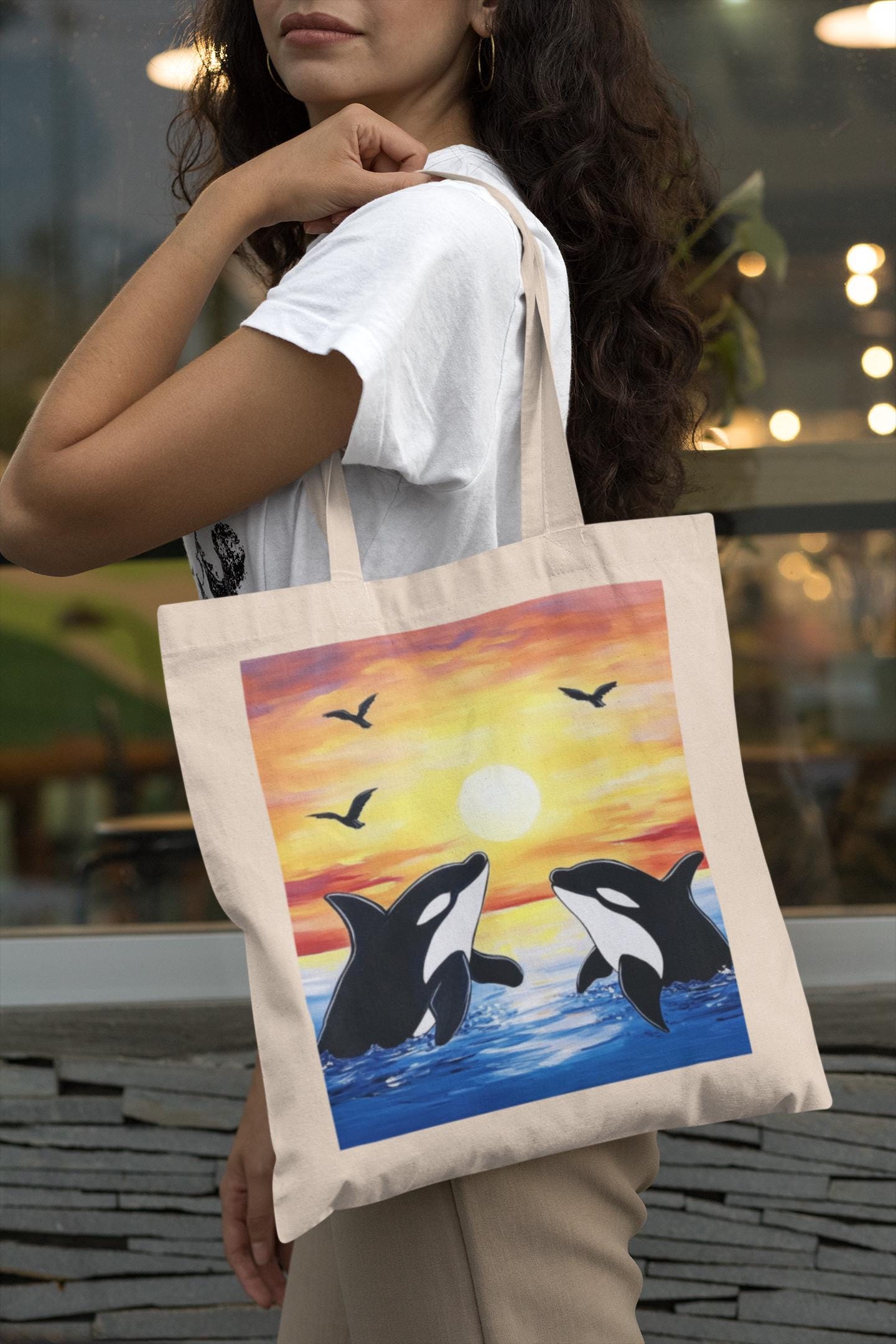 Capture the beauty of nature with the Orcas in the Sunset Sky Tote Bag, featuring a mesmerizing design of orcas gliding gracefully beneath a vibrant sunset sky. Perfect for ocean lovers, wildlife enthusiasts, and those who appreciate artistic accessories, this tote blends marine elegance with everyday practicality.
