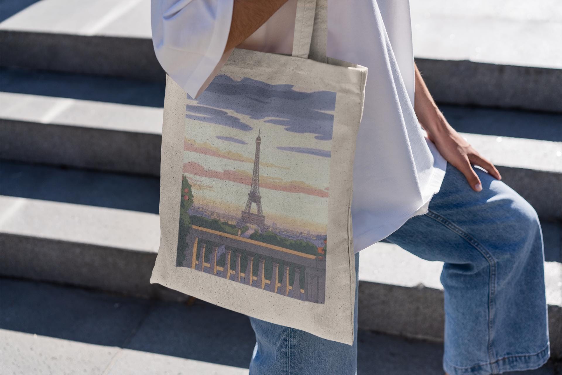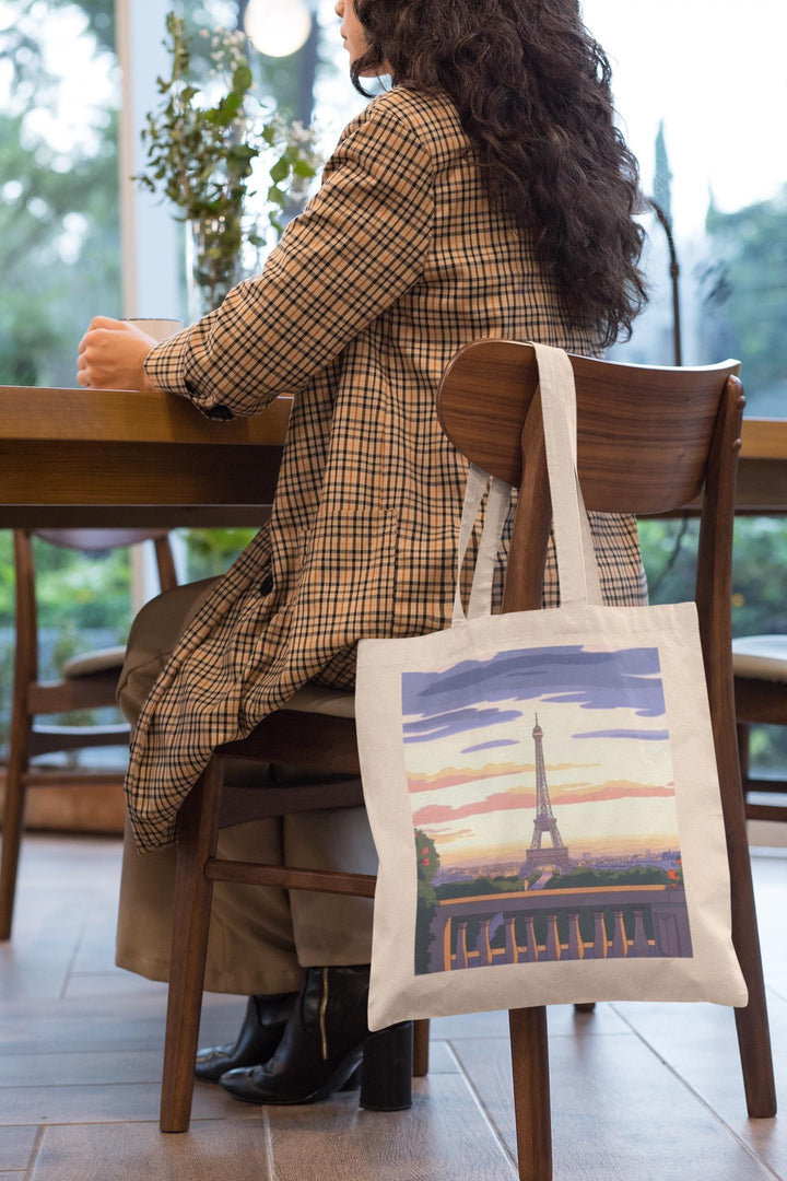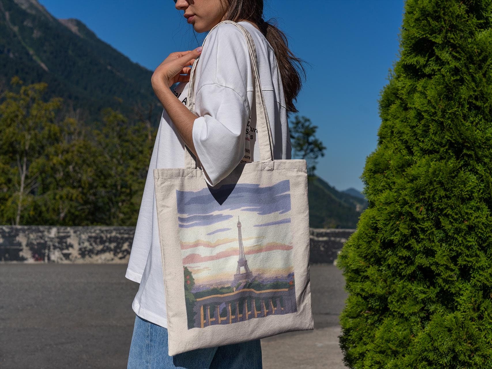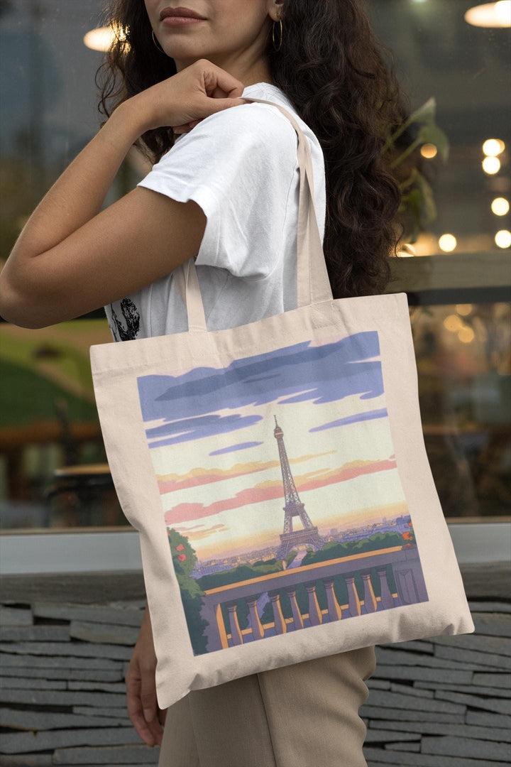 Elegant Eiffel Tower Design: Showcases a stunning depiction of the Eiffel Tower, making this tote bag a perfect accessory for lovers of Paris and all things chic.