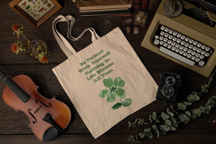 Symbolic Four-Leaf Clover Design: Featuring a beautifully rendered four-leaf clover, a universal symbol of luck, paired with the motivational phrase "Be Patient," this tote bag encourages positivity and a calm approach to life’s challenges.