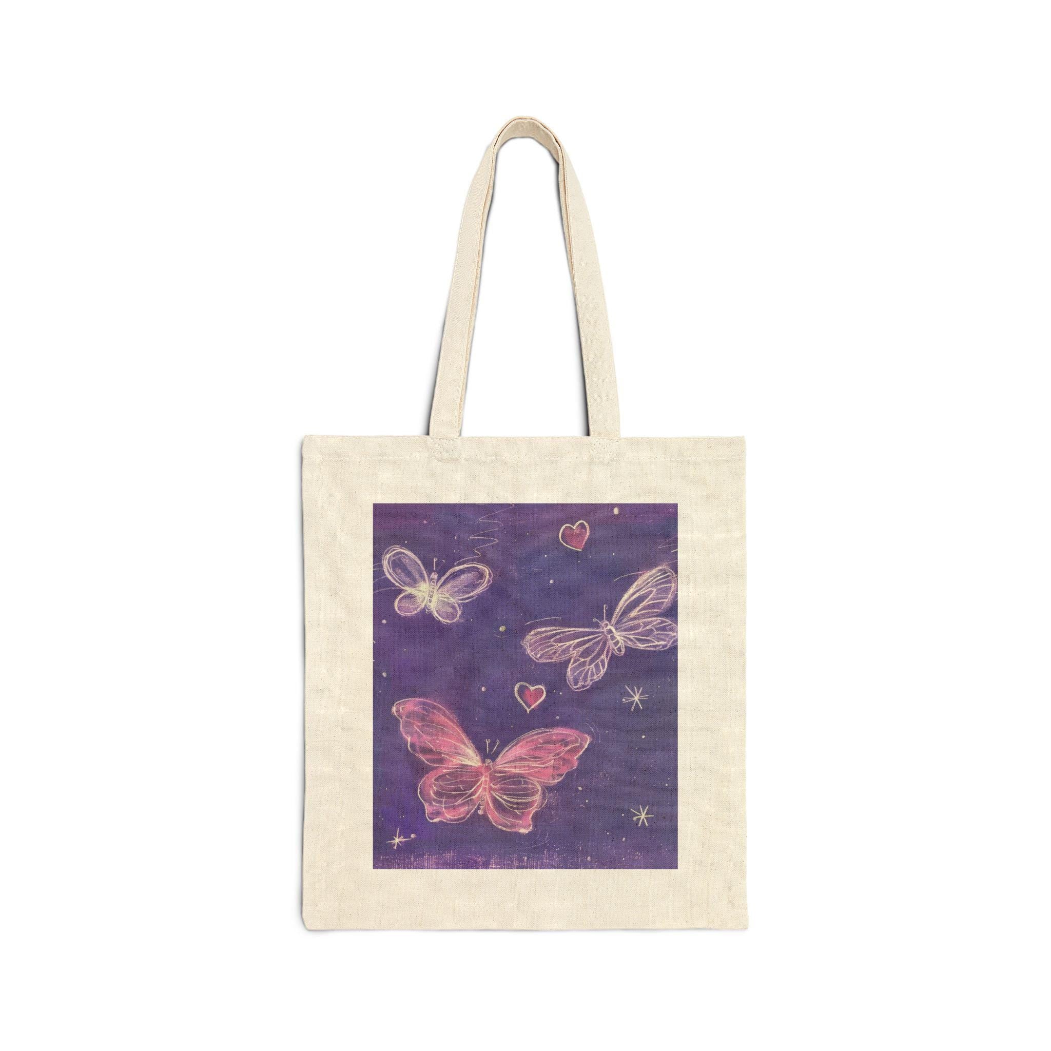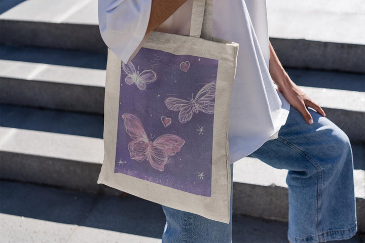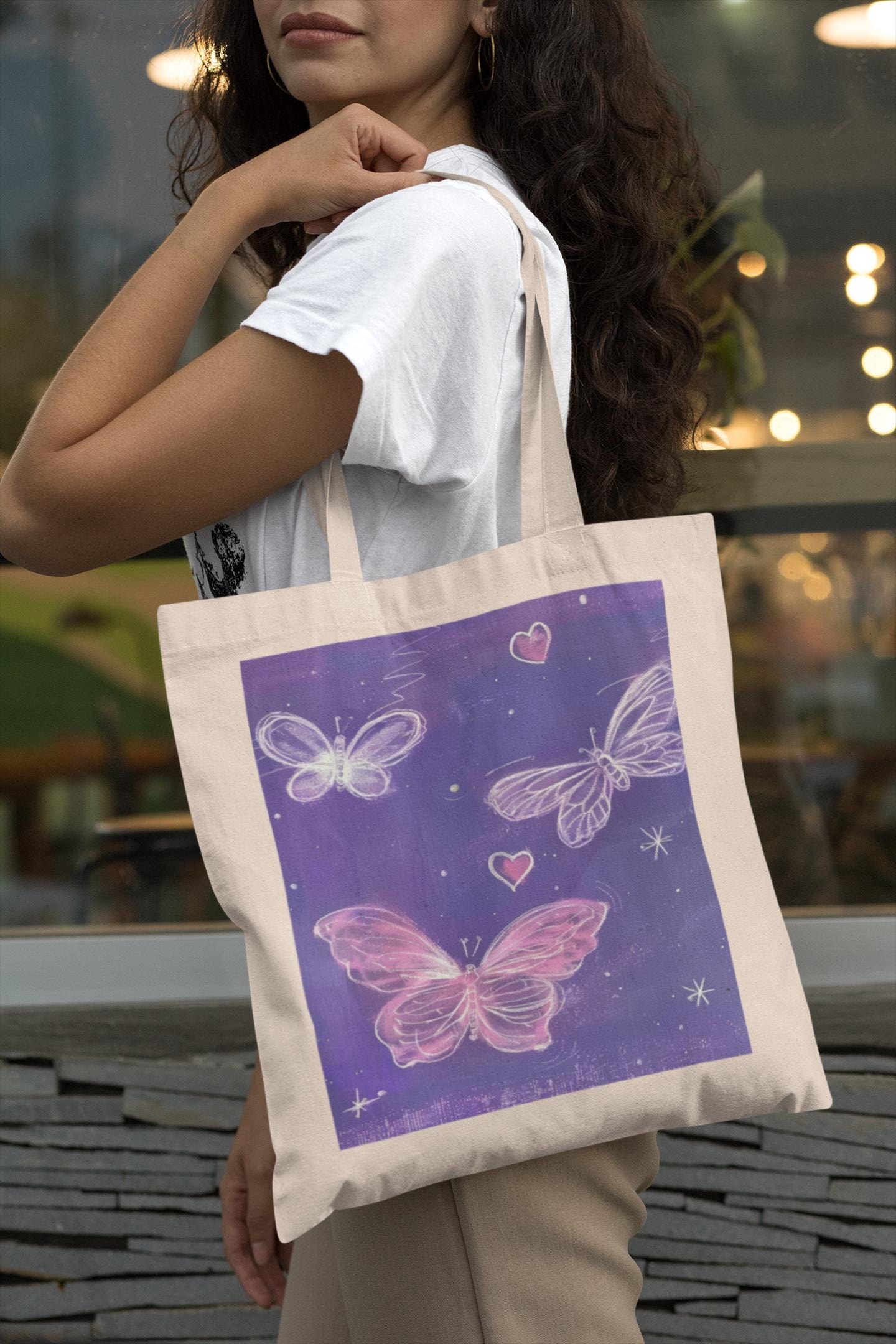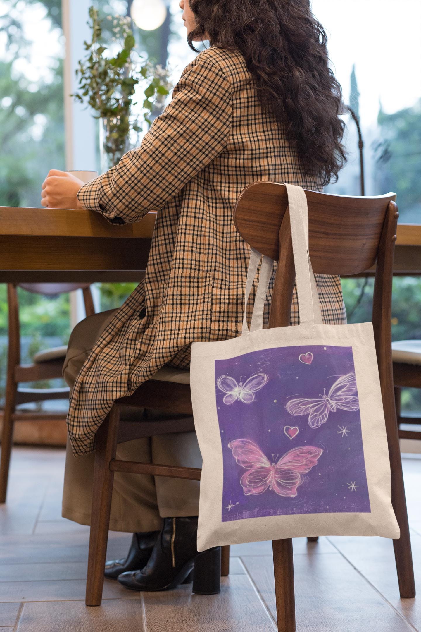 Charming Butterfly Design: Adorned with a beautiful arrangement of butterflies in pink chalk tones, this tote bag adds a touch of grace and whimsy to your outfit.
