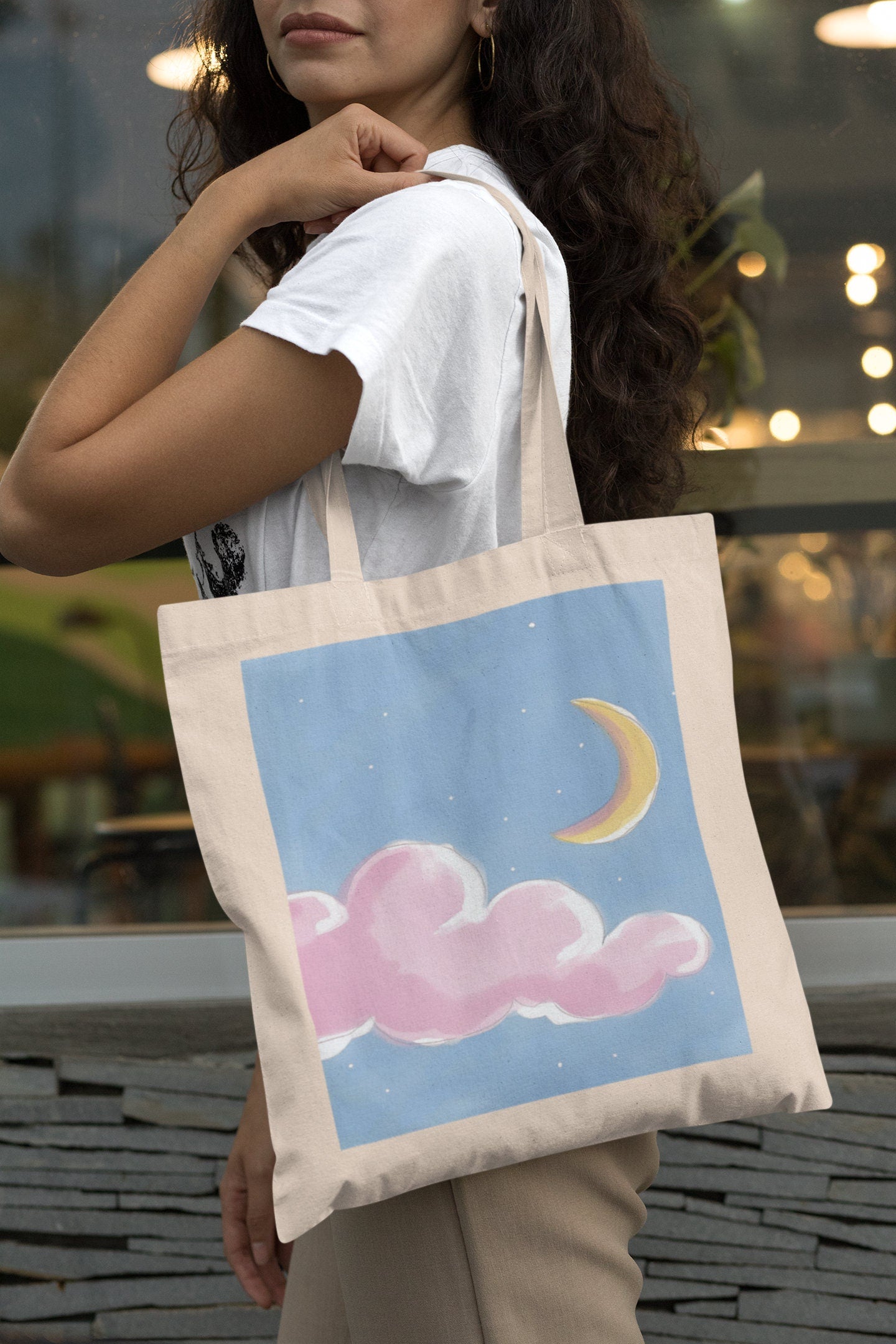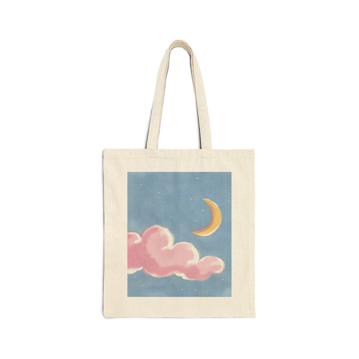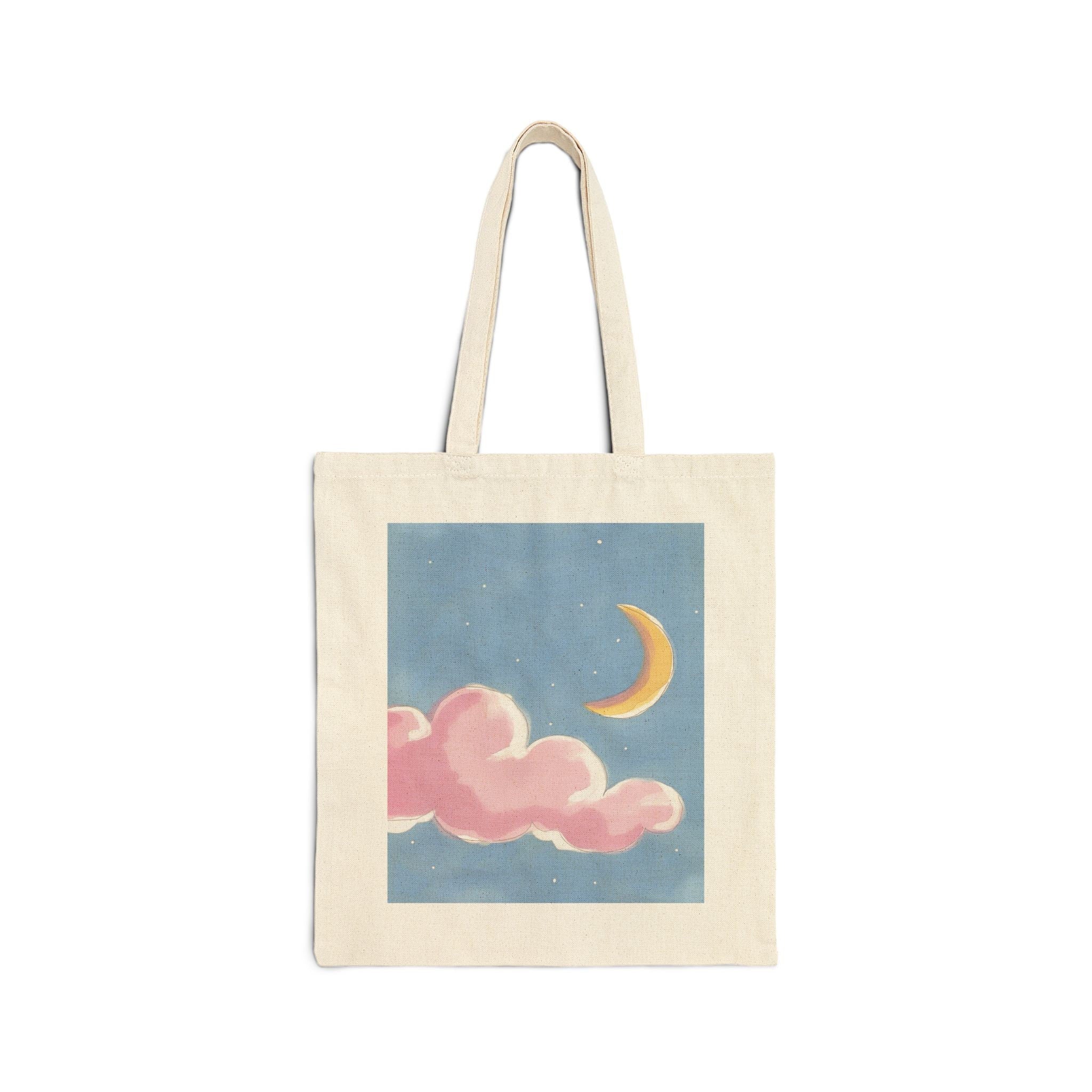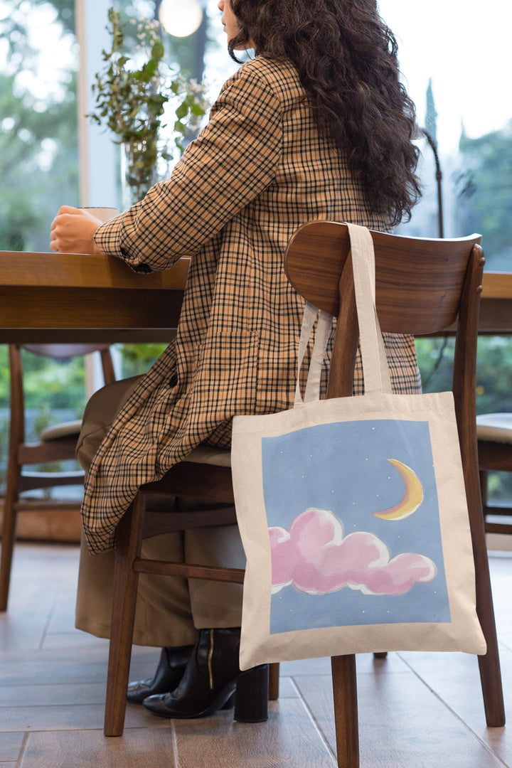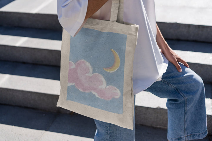 Dreamy Moon and Cloud Design: Featuring a captivating design of a pink moon surrounded by soft clouds, this tote bag adds a touch of celestial magic to your everyday style. The soothing color palette and ethereal imagery make it a standout piece.