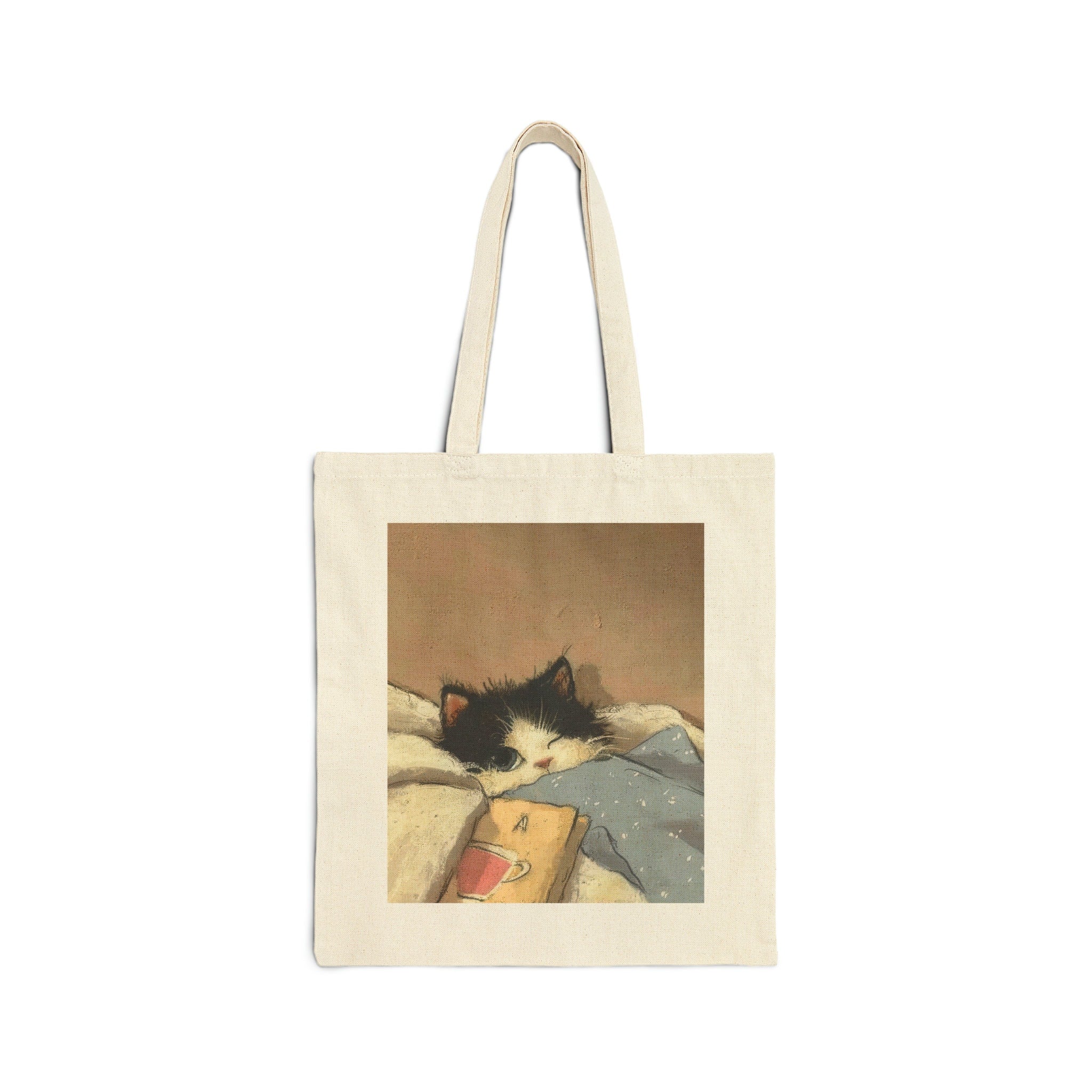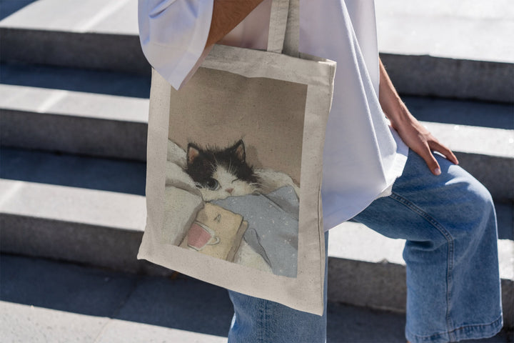 Adorable Cozy Kitty Design: Featuring an enchanting illustration of a peacefully sleeping kitten, this tote bag radiates warmth and comfort, making it a perfect companion for those who cherish life's gentle moments and the companionship of feline friends.