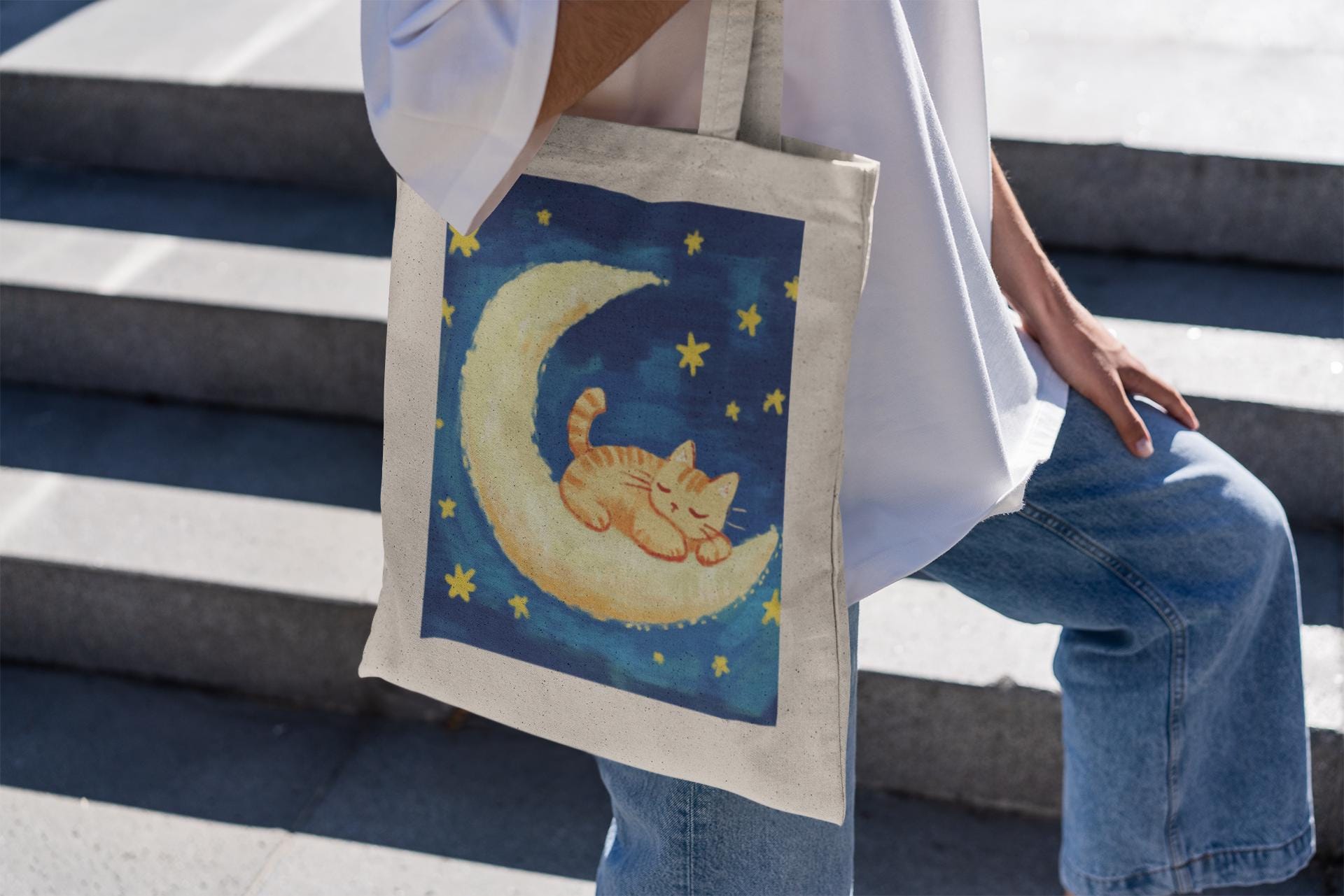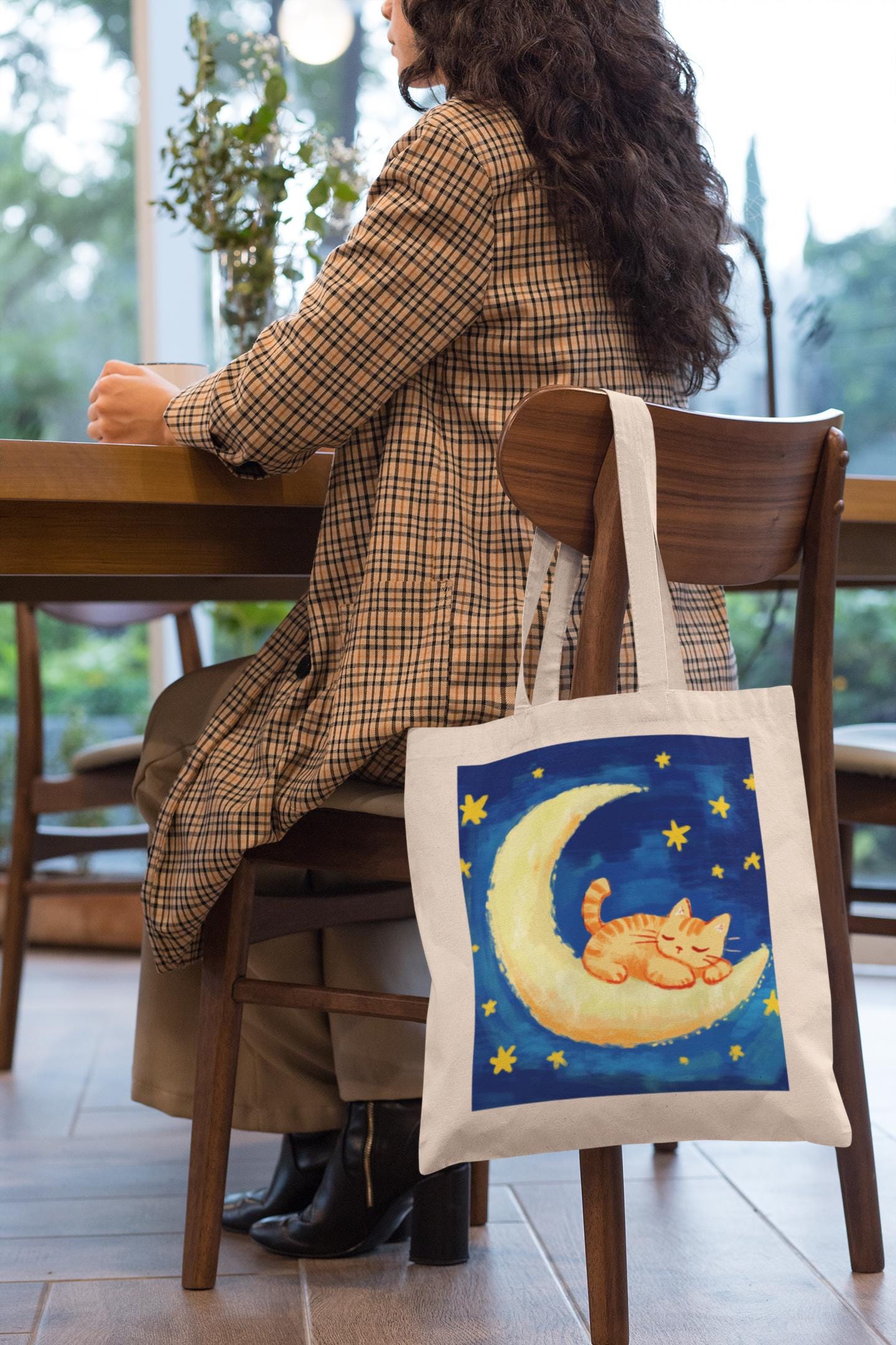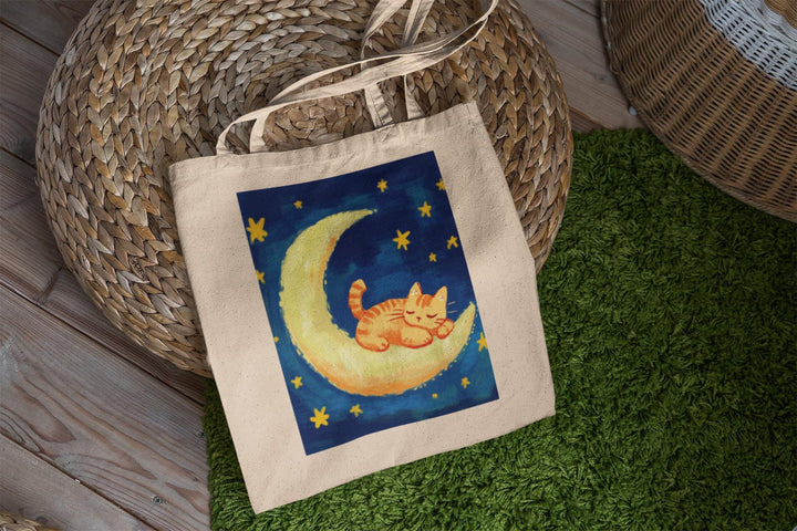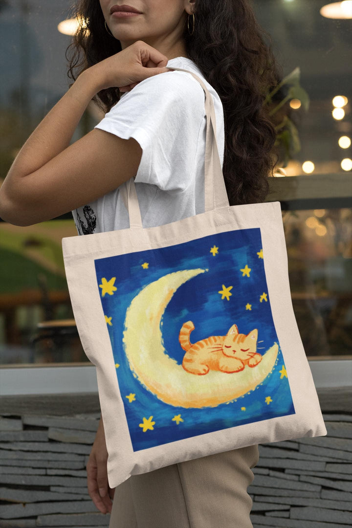 Add a dreamy touch to your style with the Sleepy Kitty on the Moon Tote Bag, where cuteness meets everyday practicality.