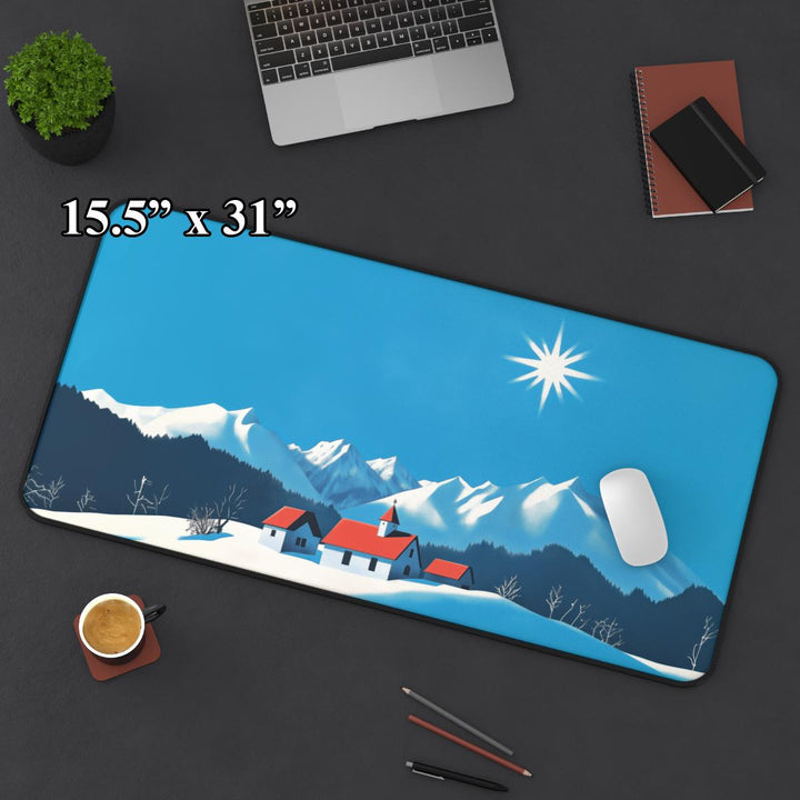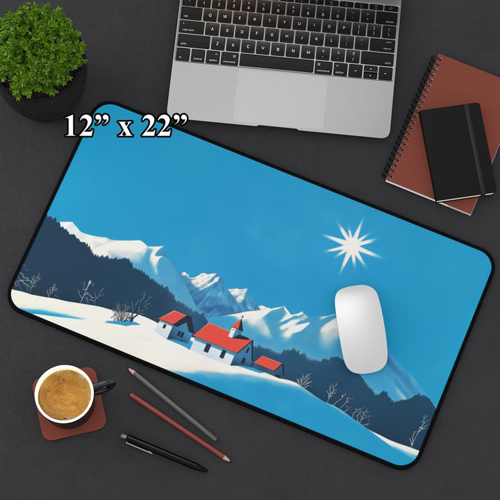 Charming Winter Design: Showcasing a beautifully illustrated small town blanketed in snow, this mouse pad adds a touch of seasonal warmth and tranquility to your workspace.