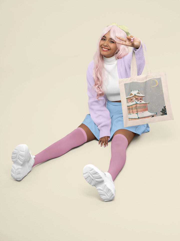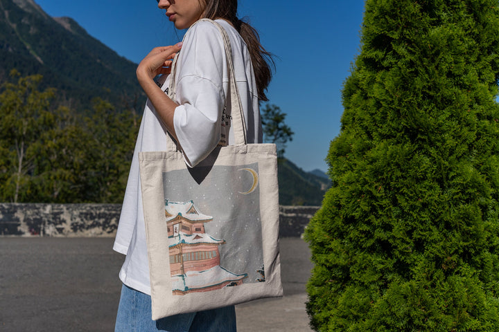 Captivating Winter Scene: Featuring a stunning depiction of a snowy night in Japan, this tote bag brings the quiet elegance of Japanese winter to your everyday life. The detailed artwork showcases traditional Japanese architecture and a peaceful snowfall, creating a mesmerizing visual experience.