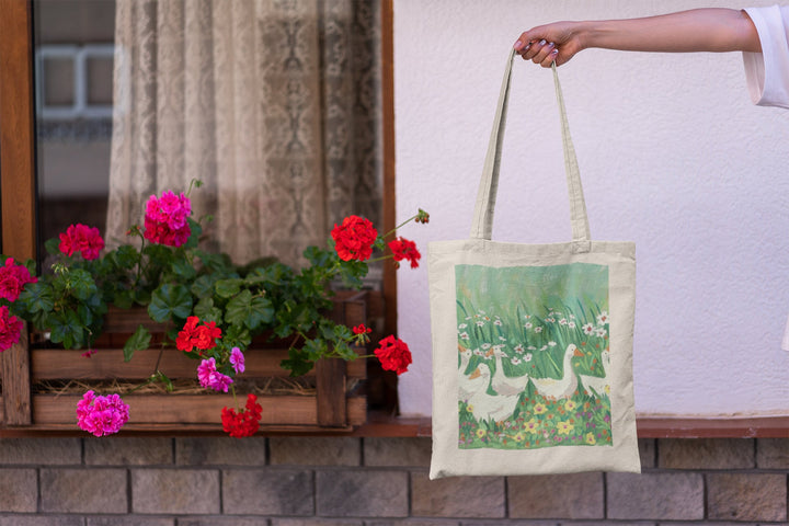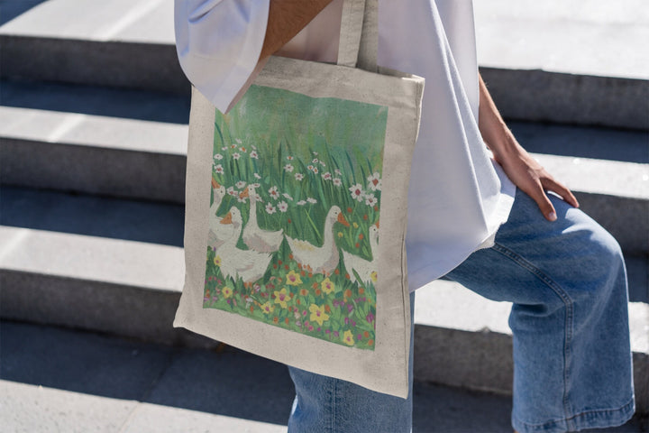Charming Duckling Design: Adorned with a heartwarming scene of young ducks amidst spring flowers, this tote bag brings a touch of nature's whimsy to your wardrobe. The playful and cute artwork is sure to draw smiles and add a cheerful vibe to any look.