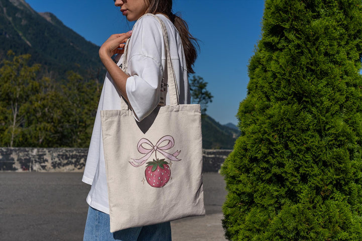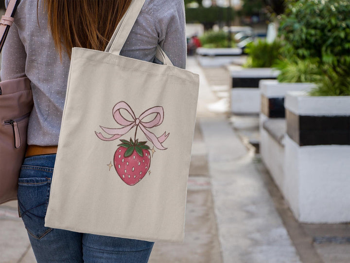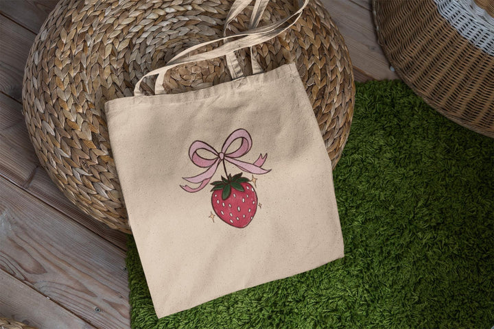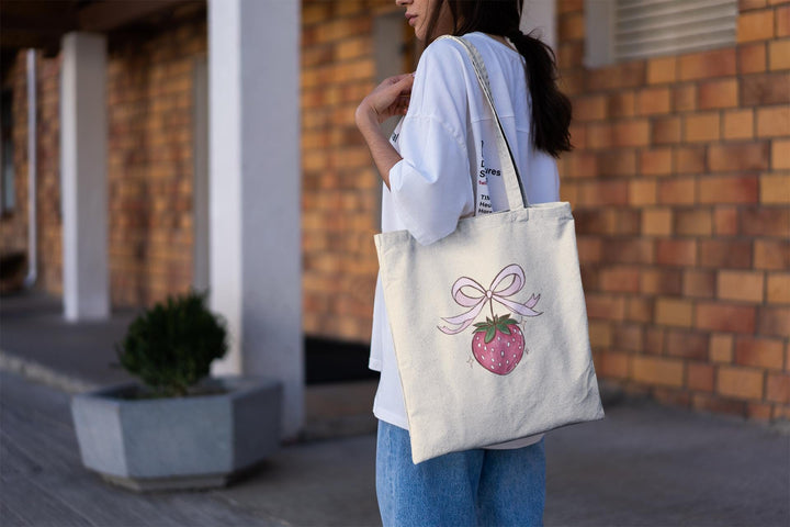 Bring a splash of sweetness to your outfit with the Strawberry Coquette Tote Bag—where fashion meets function.