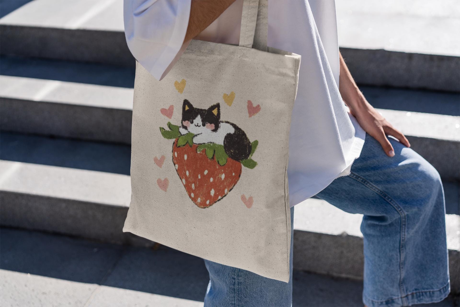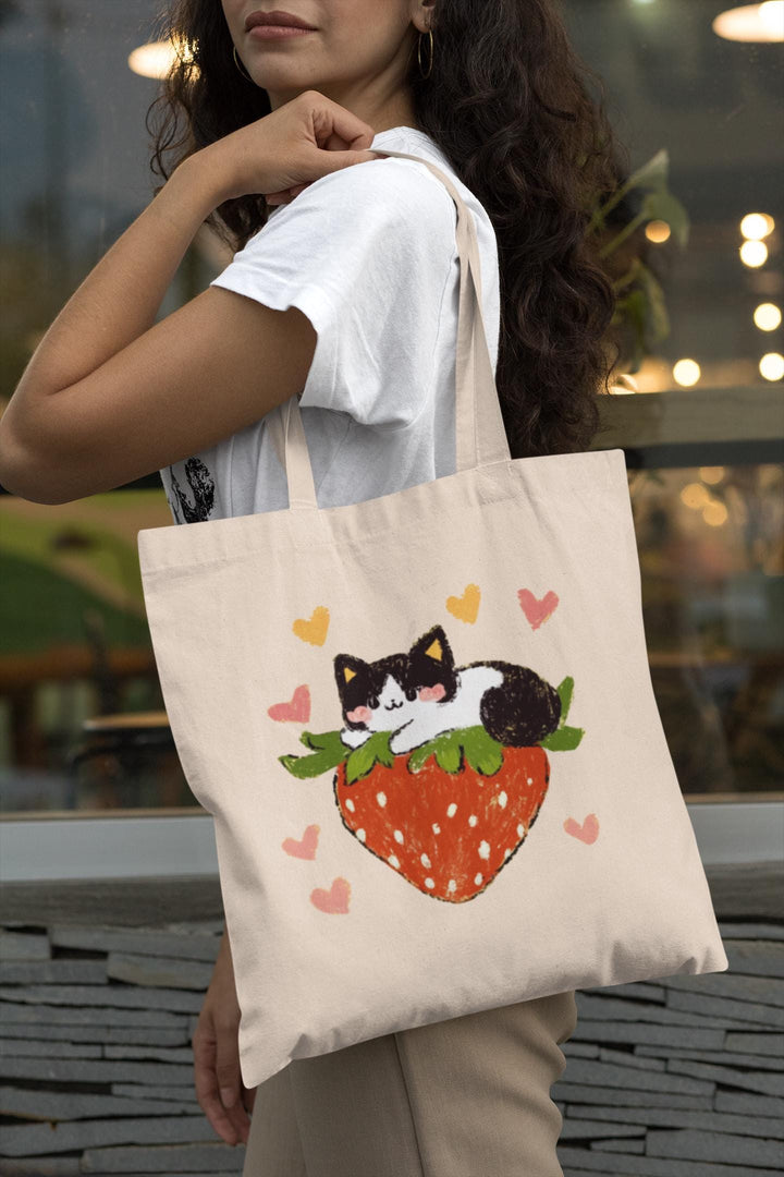 Charming Strawberry Kitty Hearts Design: Showcasing a sweet kitten nestled among strawberries and hearts, this tote brings a unique and playful vibe to any outfit.