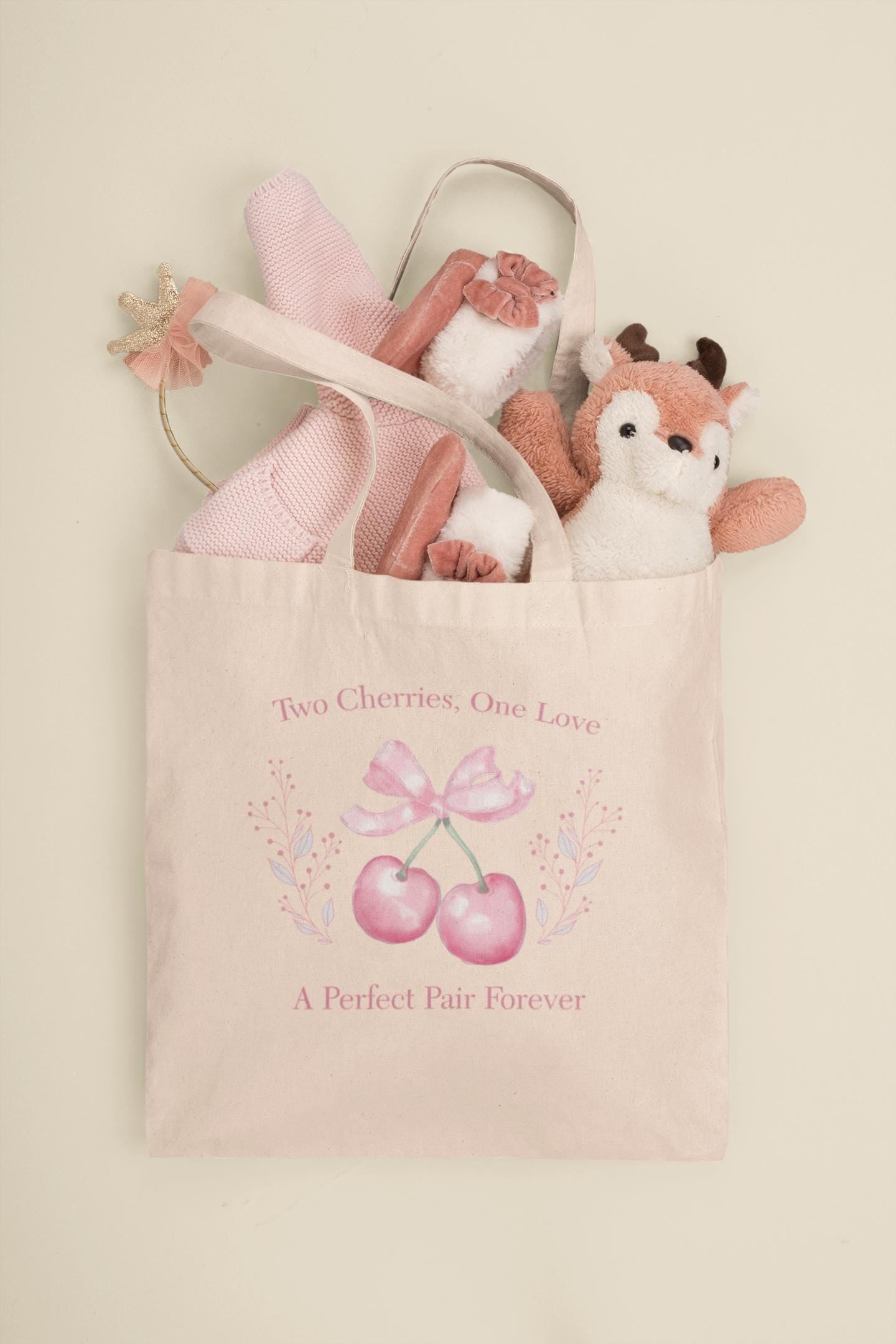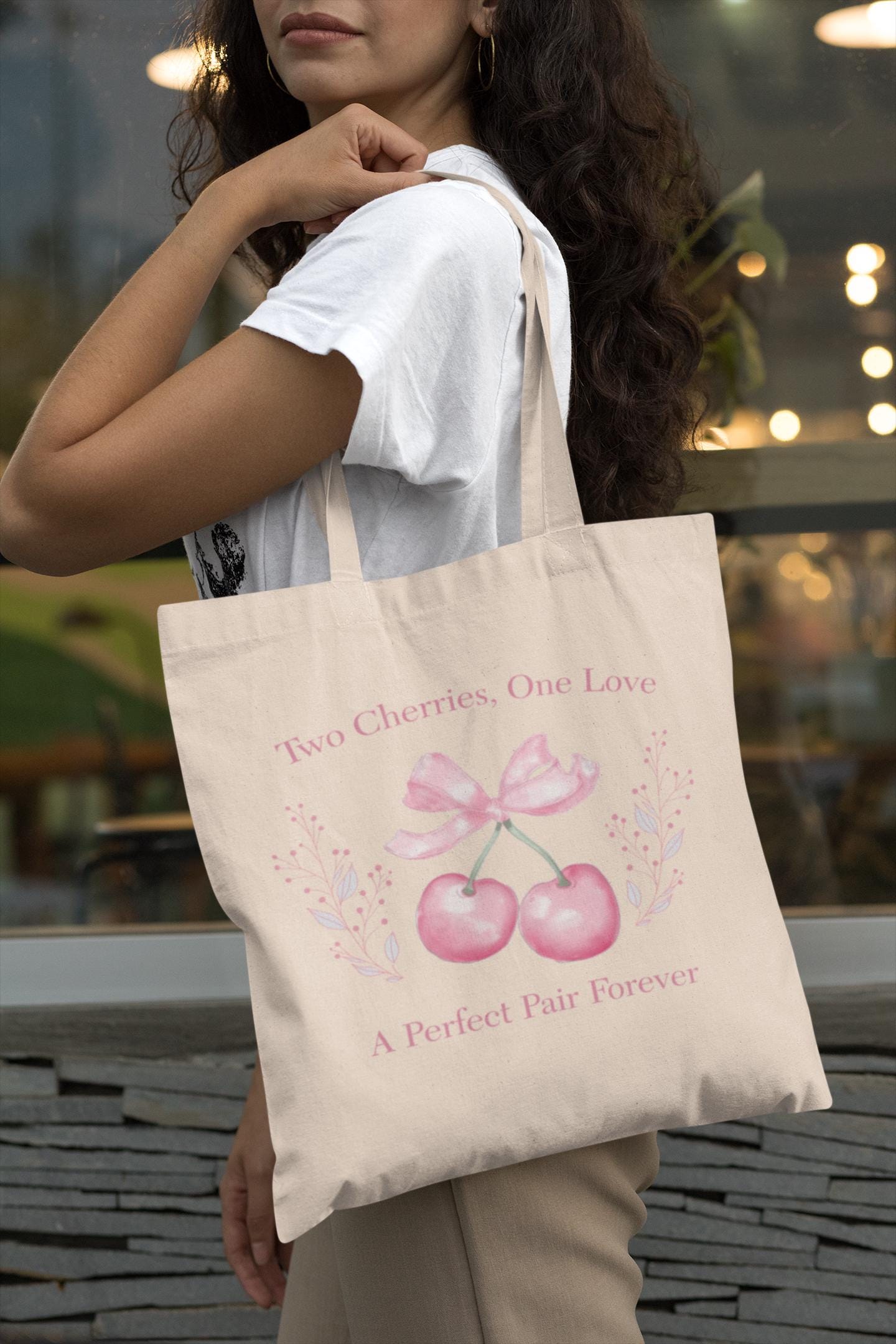 Embrace Love and Elegance with the Two Cherries, One Love Tote Bag. This charming tote bag symbolizes love and unity with its beautiful cherry design, making it a perfect accessory for anyone who appreciates romance and style.