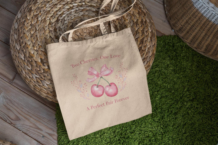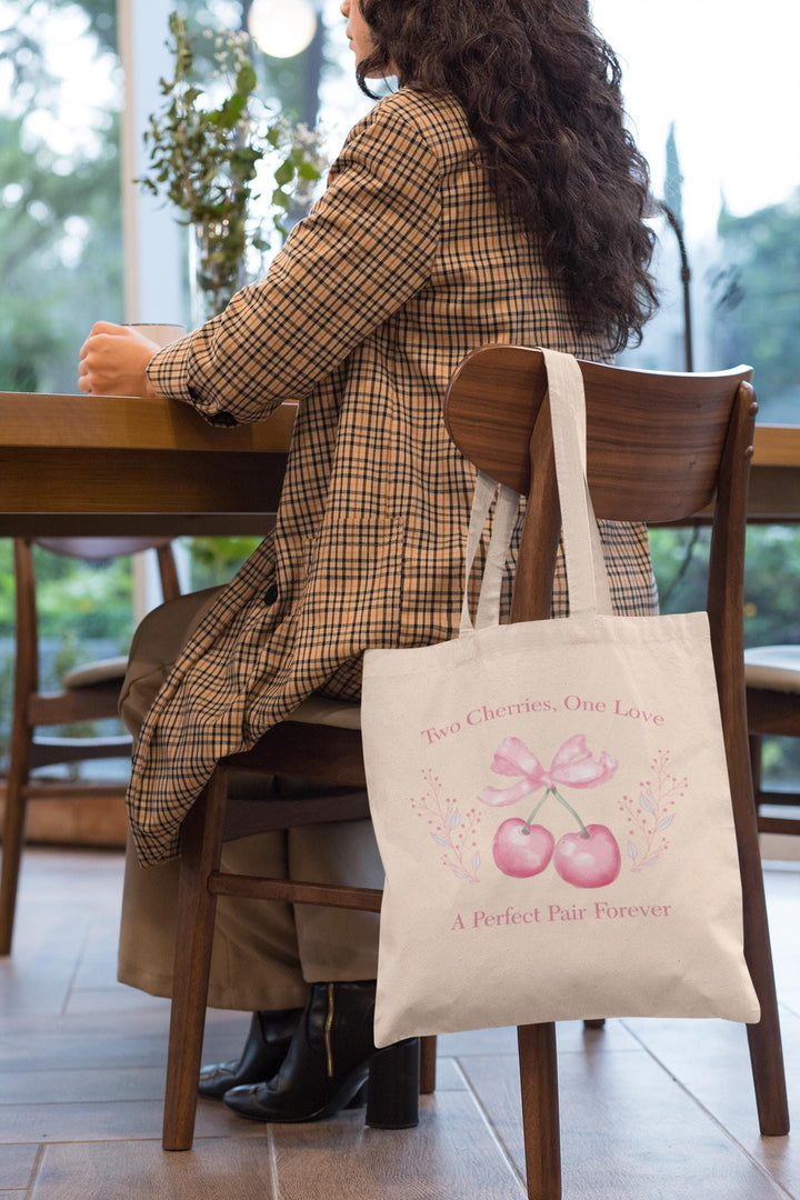 Timeless Message: With the heartfelt phrases "Two Cherries, One Love" and "A Perfect Pair Forever" printed on the bag, this tote beautifully expresses the sentiment of lasting love, making it ideal for couples or anyone celebrating special bonds.