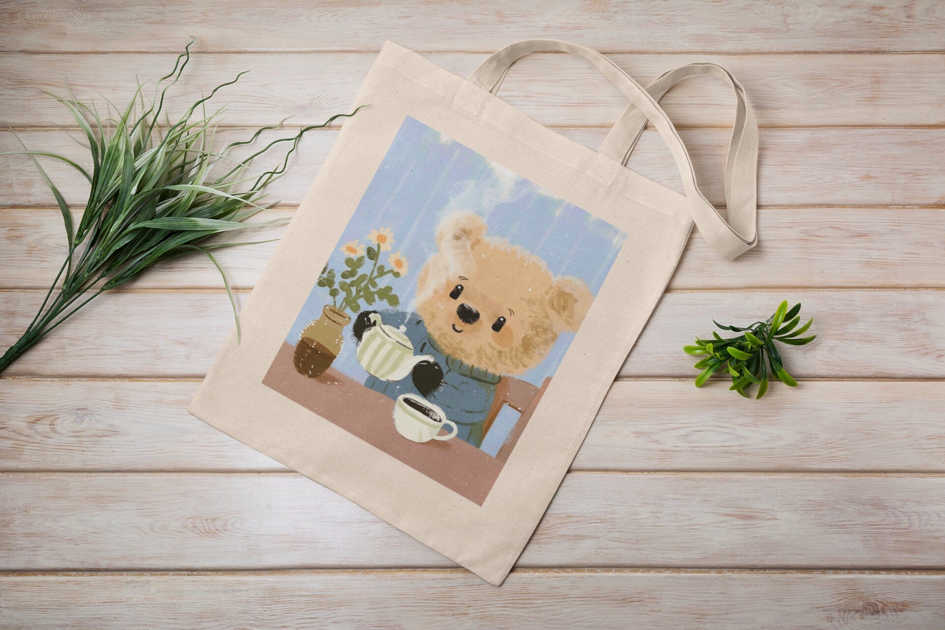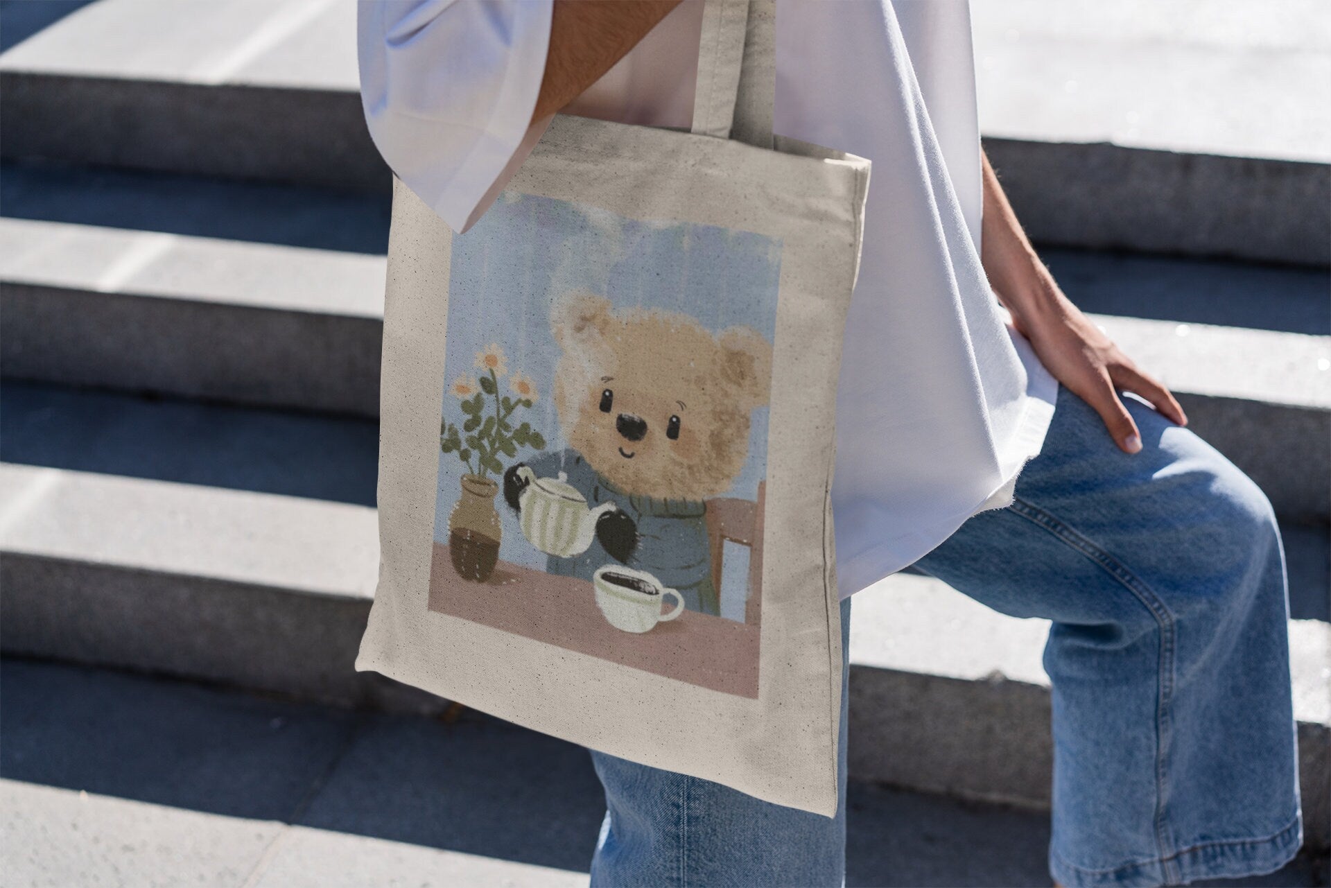 Adorable Tea Time Bear Design: Featuring a delightful illustration of a bear enjoying a peaceful tea time, this tote bag captures the joy and tranquility of a tea break. The playful artwork invites smiles and adds a whimsical touch to your ensemble.
