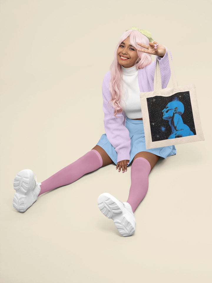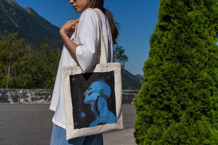 Celestial Design: Adorned with an enchanting stargazing-themed illustration, this tote bag invites you to carry a piece of the universe wherever you go. Its captivating design features stars, planets, or a lone observer under the night sky, evoking the infinite beauty of the cosmos.