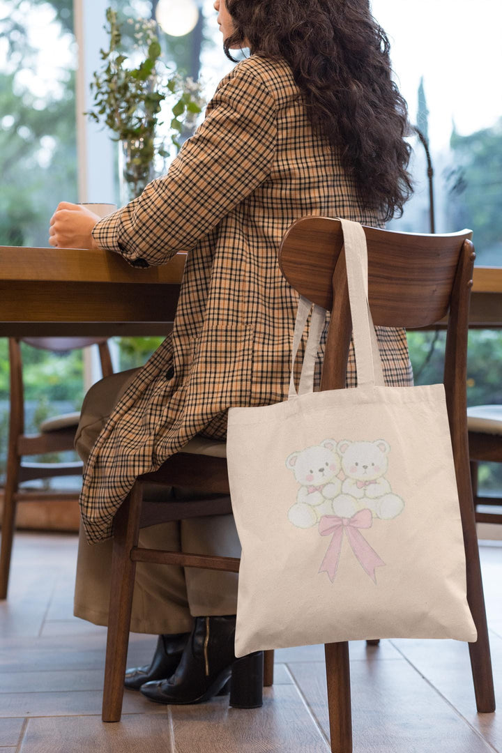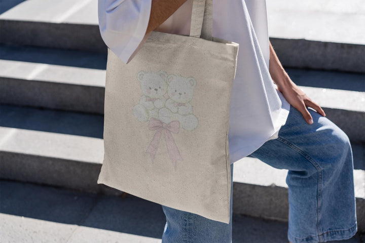 This delightful tote bag captures the heartwarming innocence of two plush teddy bears, perfectly paired and tied together with a soft pink ribbon. Whether you're a lover of all things cute or searching for the perfect gift, this tote bag is sure to bring a smile to anyone's face.