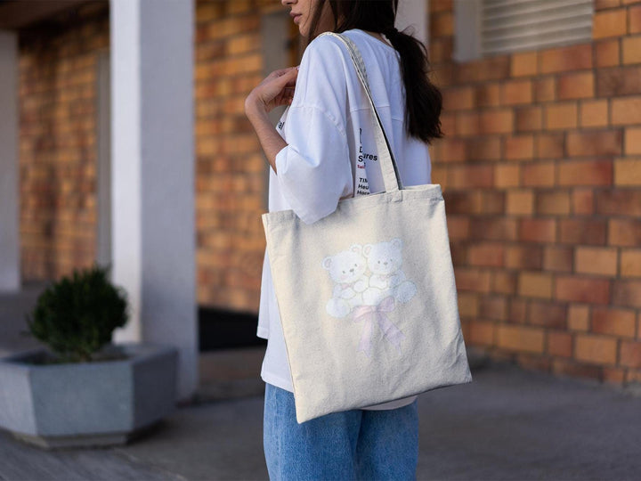 Coquette Teddy Bear Design: Featuring two fluffy white teddy bears sitting side by side, this tote bag exudes warmth and affection. The soft, pastel tones and gentle shading create a soothing, cozy aesthetic that’s perfect for any occasion.