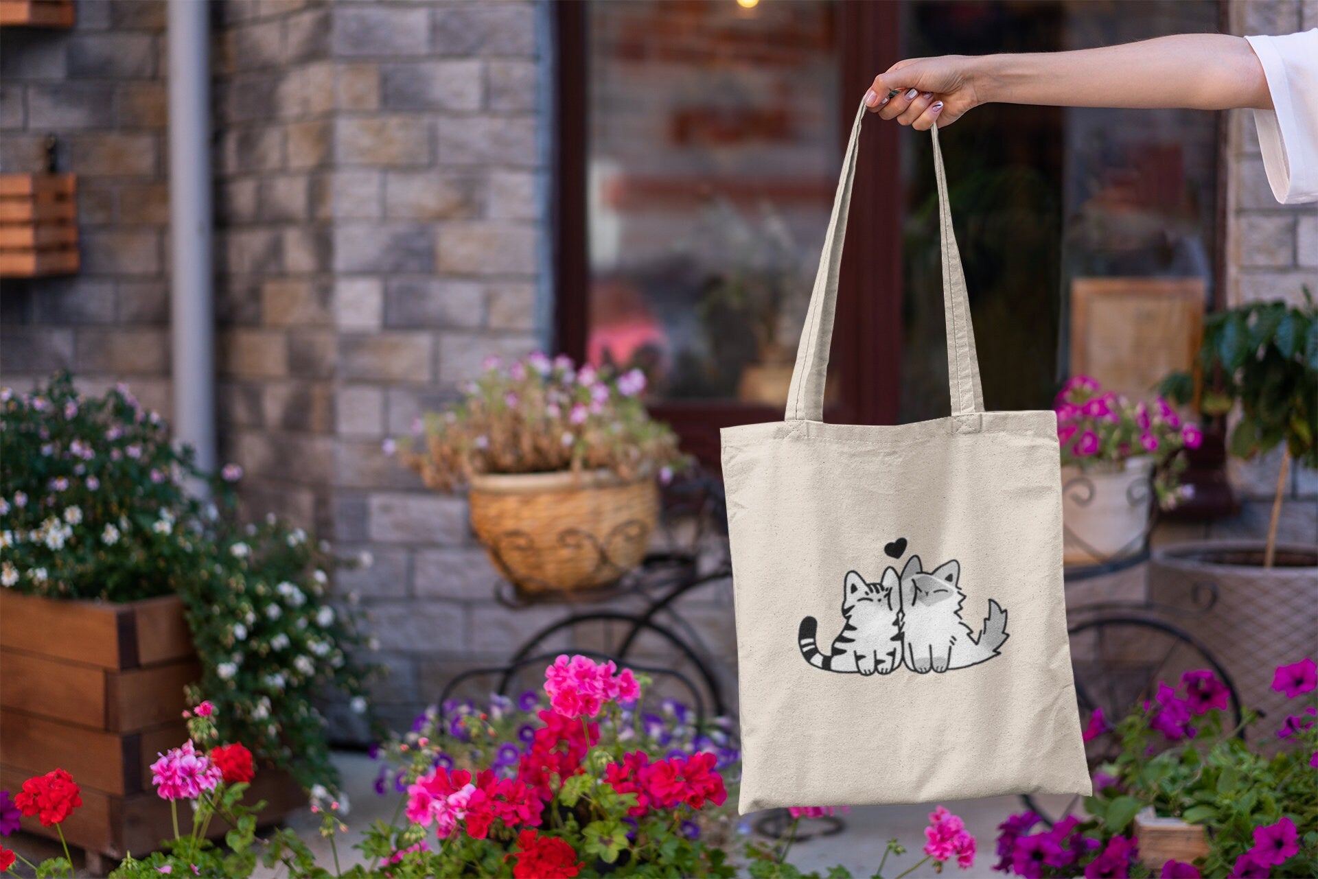 Adorable Cat Couple: Adorned with an irresistibly cute illustration of two kitties sharing a smooch, this tote bag embodies the essence of love and companionship, making it an ideal choice for cat lovers, romantics, and anyone who appreciates the sweetness of furry friends.