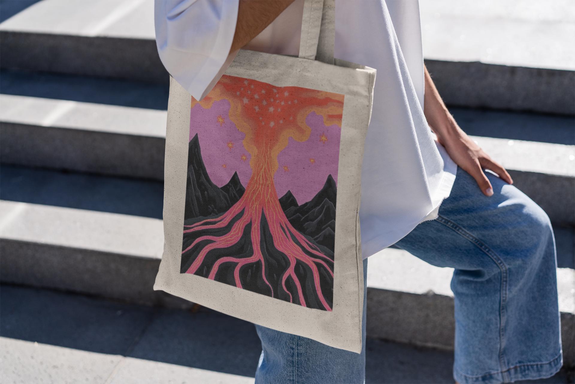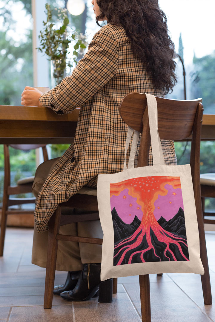Embrace the balance of power and tranquility with the Volcano Star Tote Bag—where fiery landscapes meet the calming night sky.