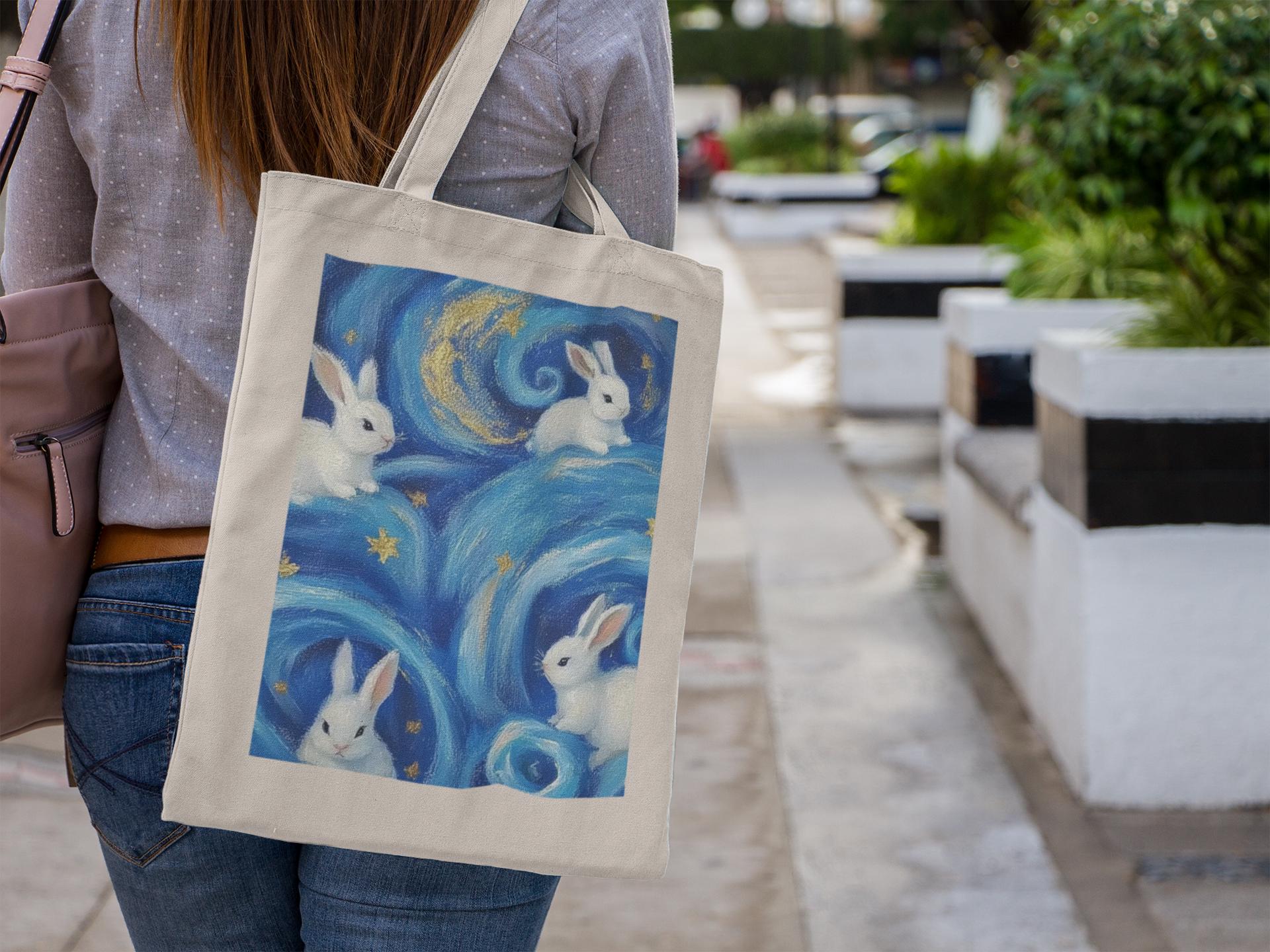 Step into a world of wonder with the White Rabbit Star Swirl Tote Bag, featuring an adorable white rabbit surrounded by a swirl of stars and cosmic charm. This aesthetic tote bag is perfect for dreamers, bunny lovers, and fans of magical, whimsical art.
